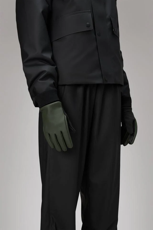 I guanti sono un accessorio isolante con un’estetica essenziale, per tenere le mani calde e asciutte nei climi freddi e piovosi. Il design prevede le estremità del pollice e dell’indice compatibili per touchscreen, palmi in neoprene e un polsino a costine con risvolto.