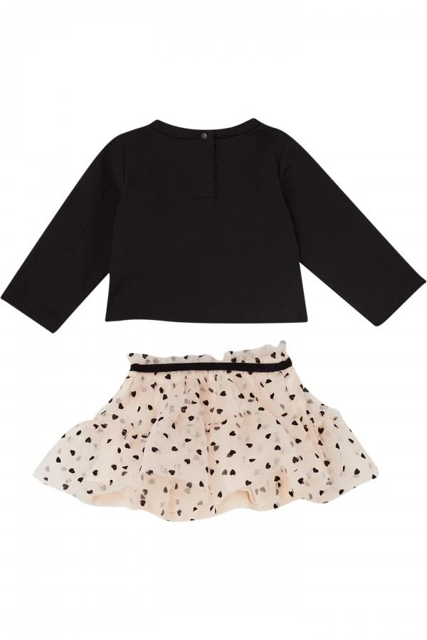 Completino due pezzi Liu Jo Junior, modello con t-shirt maniche lunghe e gonna con stampa cuori in contrasto all over