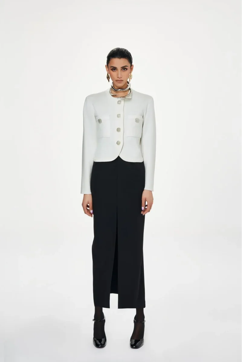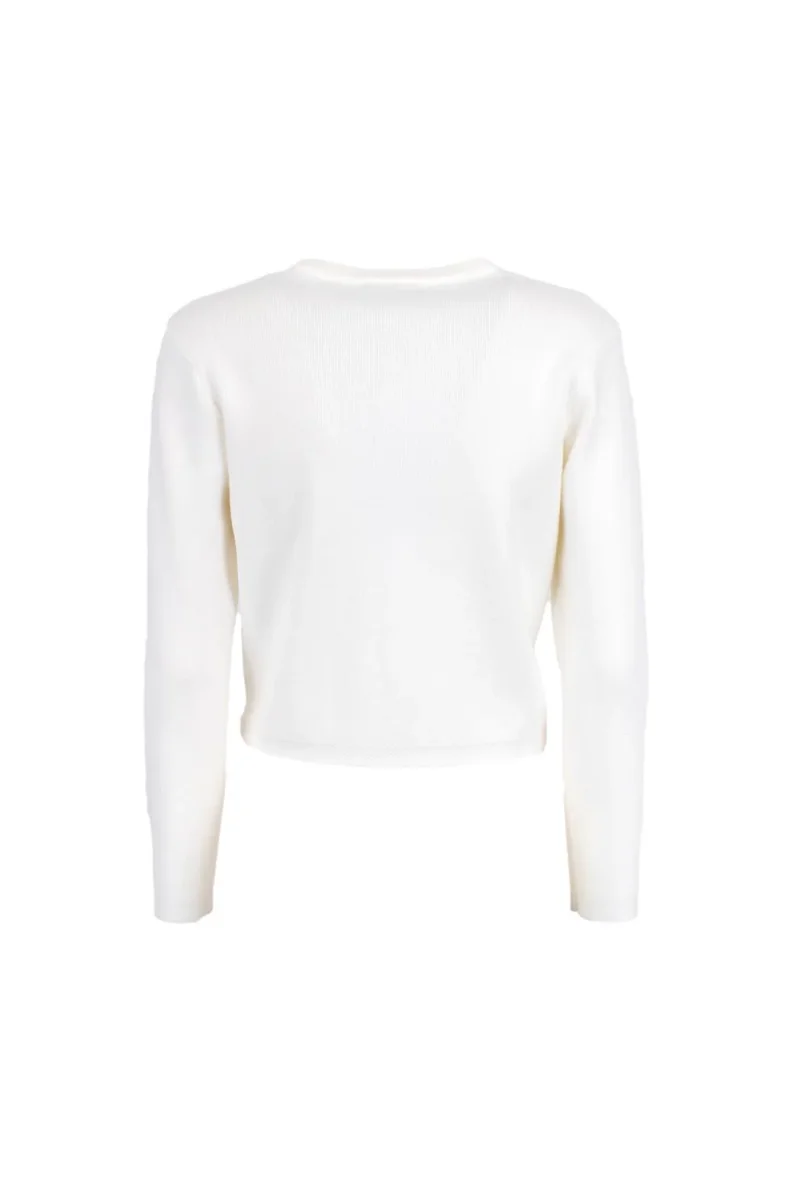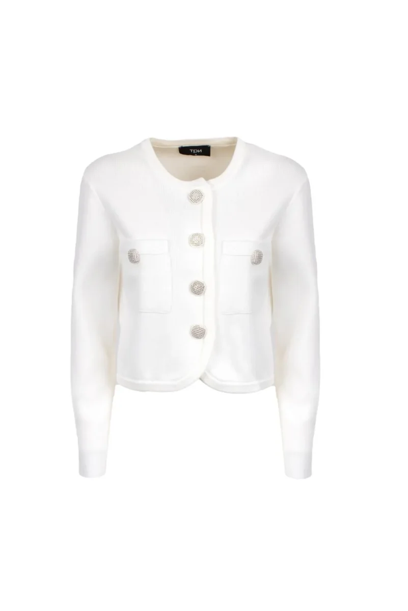 Cardigan TPN modello corto a maniche lunghe con scollo rotondo, chiusura con bottoni gioiello, taschini applicati sul davanti, colore bianco