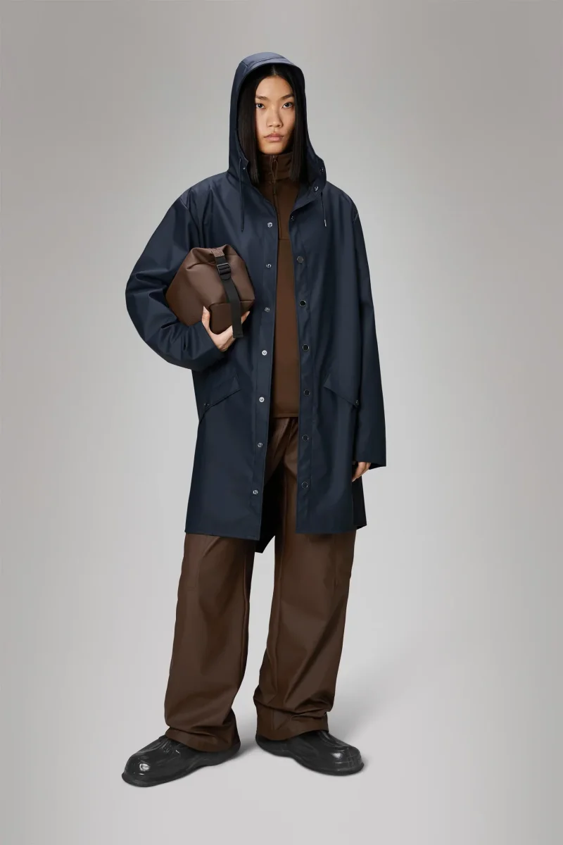 Long Jacket Rains, modello impermeabile antipioggia unisex, abbottonatura con automatici, cappuccio con visiera incorporata e due tasche laterali con automatici, maniche regolabili con bottoni, vestibilità ampia. Colore blu