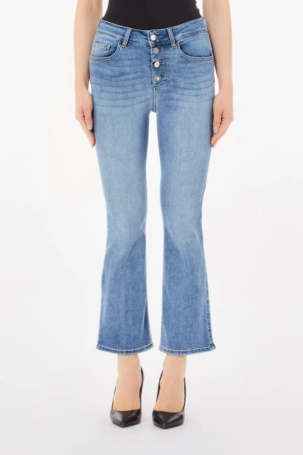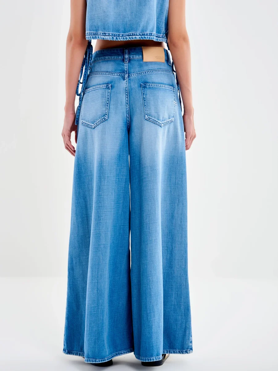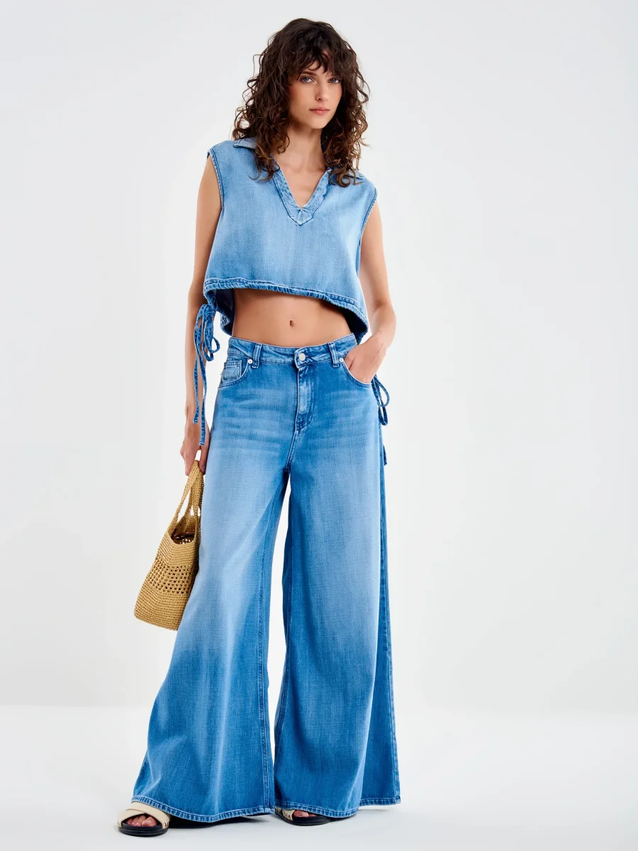 Jeans Lucy Vicolo, gamba ampia e vita media, modello cinque tasche, chiusura frontale con zip e bottone in metallo, gamba lunga ampia, denim effetto slavato