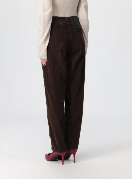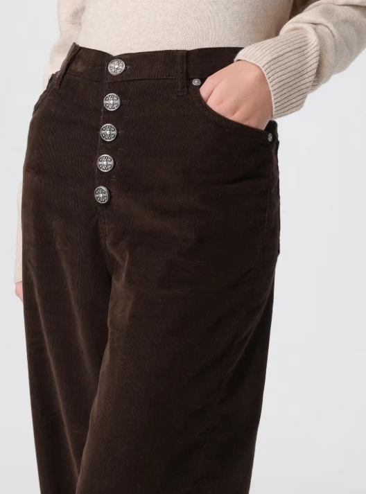 Jeans Koons Dondup donna, modello in denim di cotone, cinque tasche, vita alta, chiusura bottone gioiello, colore marrone