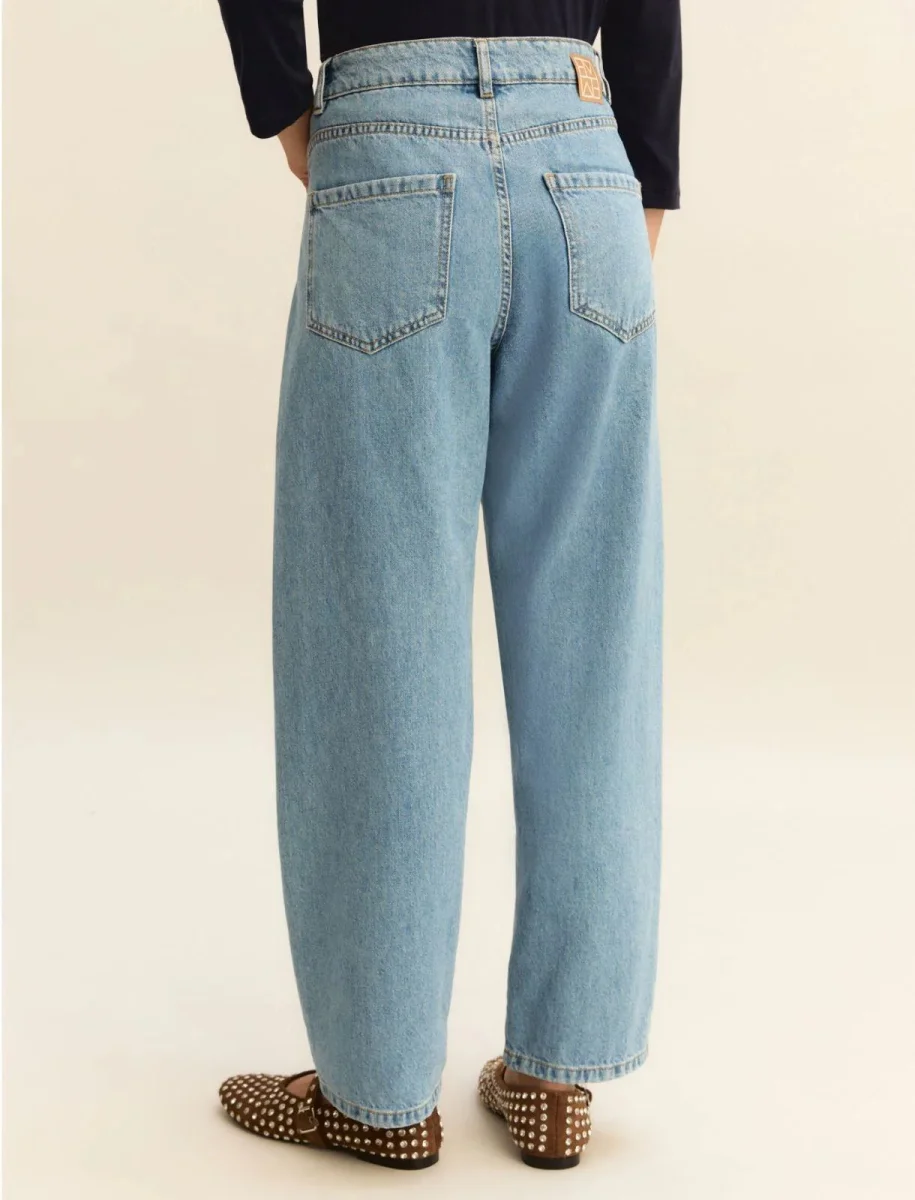 Jeans 5 tasche mom fit, fit regolare, linea mom ampia sulla gamba, chiusura con bottone metallico, etichetta personalizzata, colore blue jeans