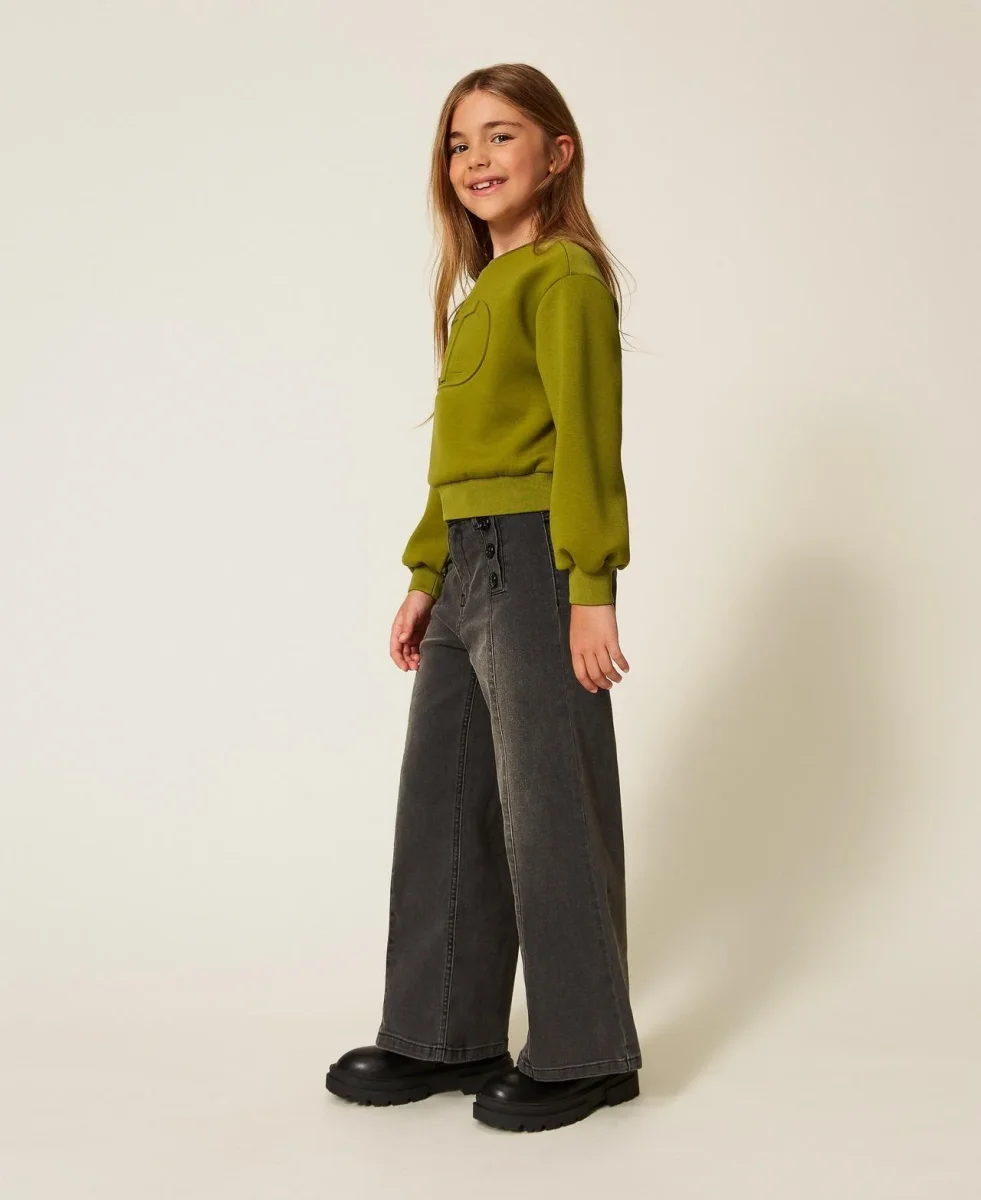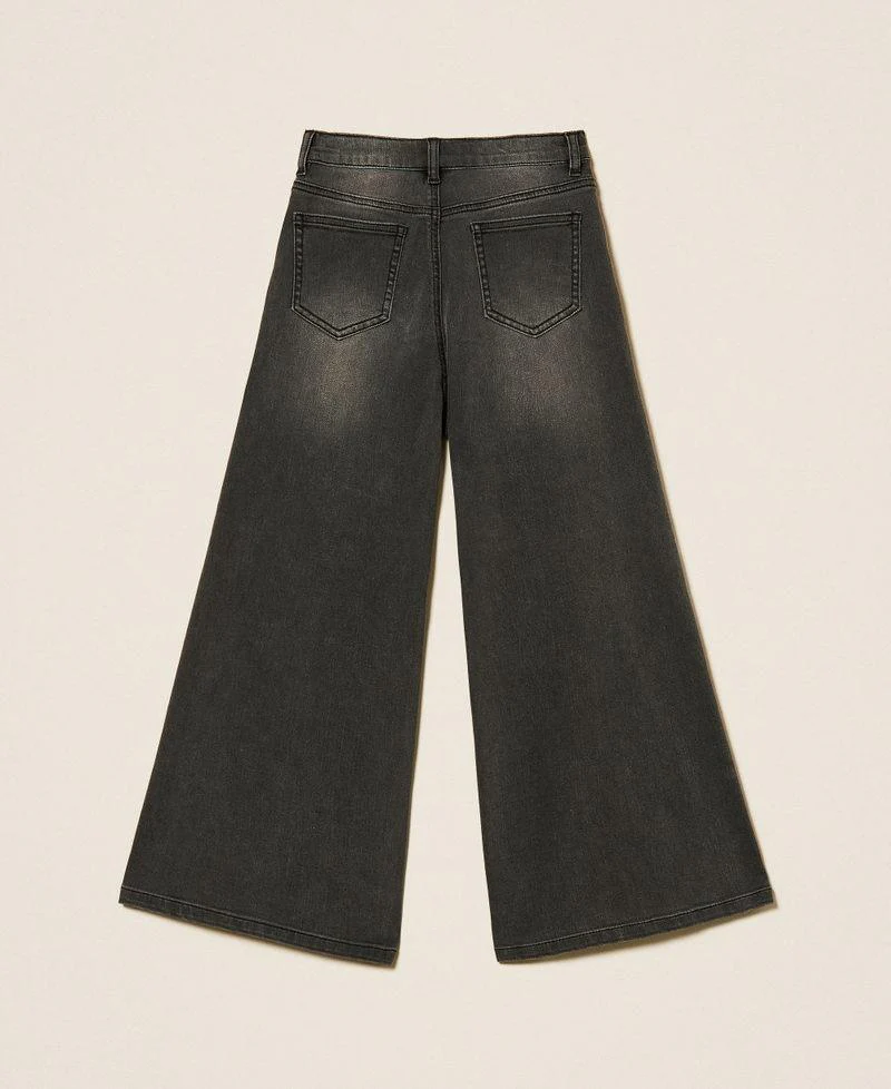 Jeans Twinset Girl, modello in denim delavè con tagli verticali sul davanti, finte tasche a filetto con bottoni a pressione logati, passanti in vita, chiusura con zip e bottone