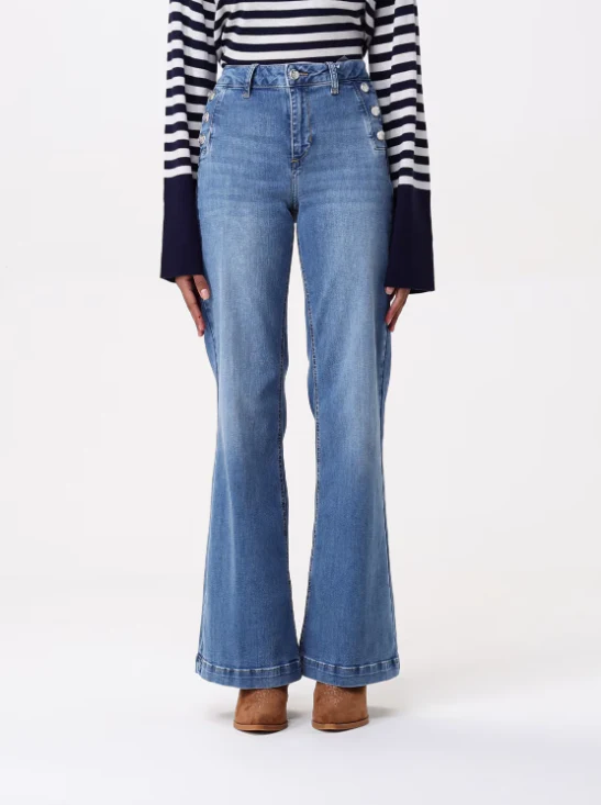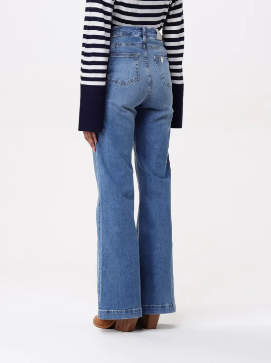 Jeans con bottone e zip Liu Jo, modello con toppa posteriore, cita alta con passanti, realizzata in denim di cotone, colore blu