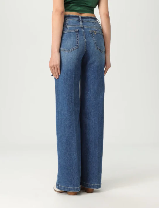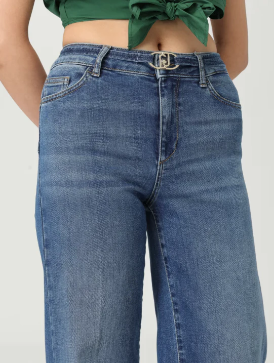 Jeans Liu Jo donna, modello con bottone e zip in vita con dettaglio applicato, cinque tasche, cinta regolabile, denim di cotone