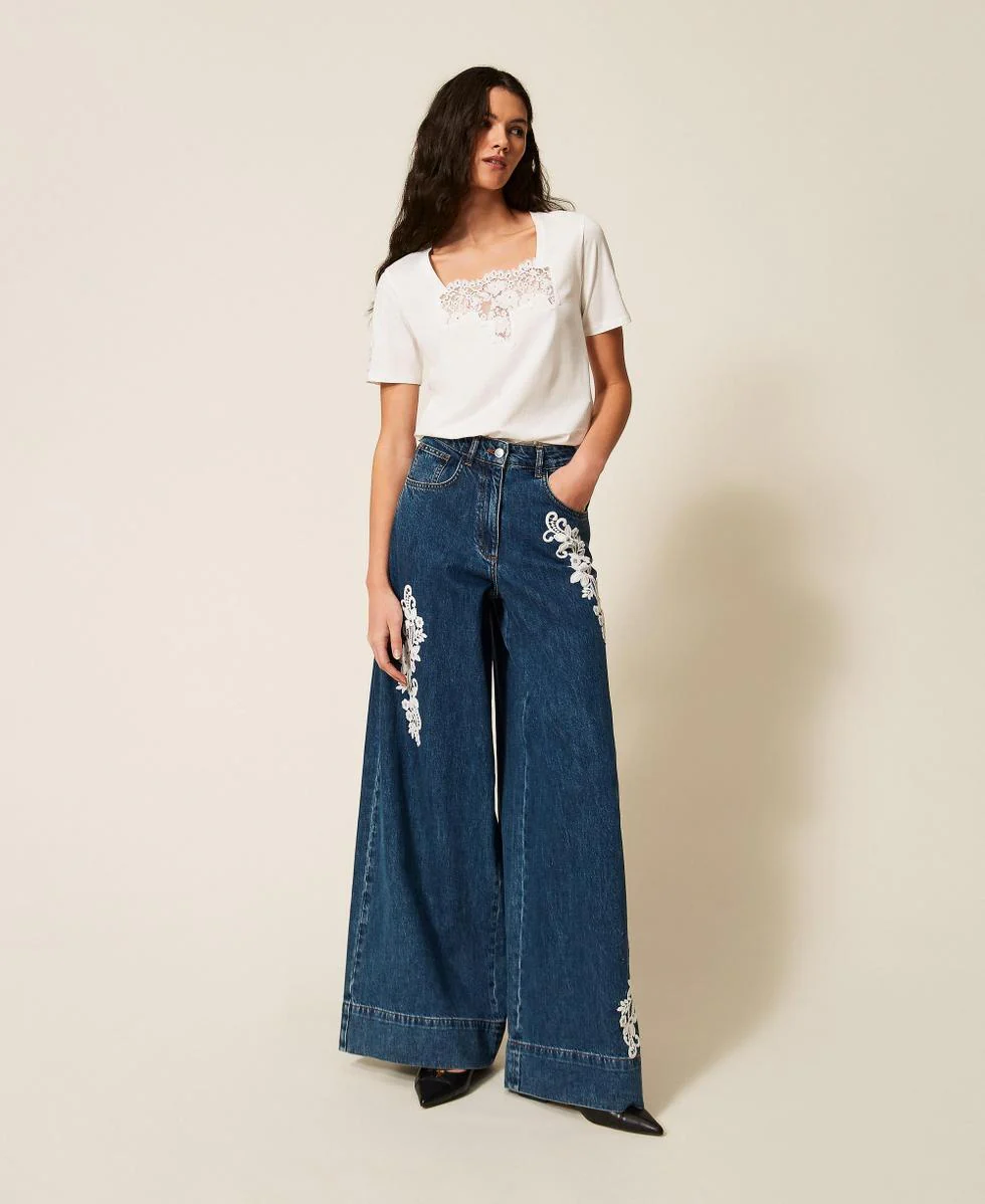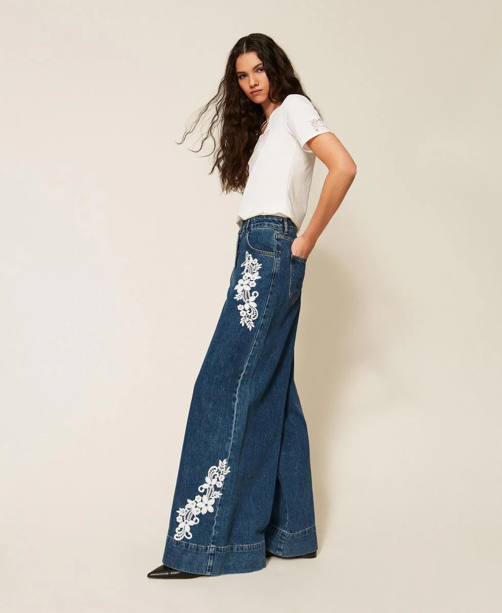 Jeans Twinset Actitude, modello con patch pizzo applicati, passanti in vita, chiusura con zip e bottone, cinque tasche e linea ampia, colore blu