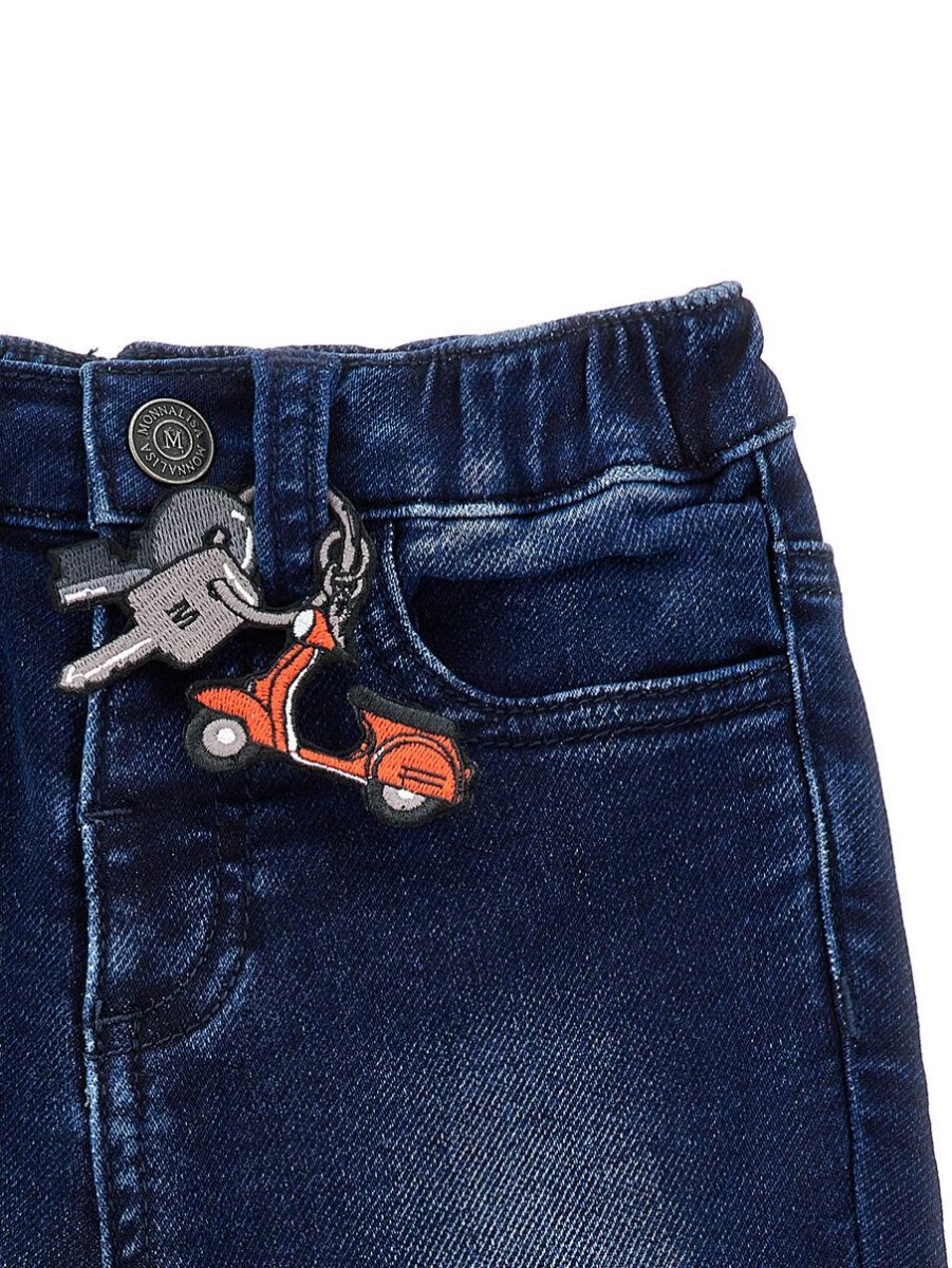 Jeans 5 tasche Monnalisa, modello con ricami scooter nel risvolto, chiusura con zip e bottone, cintura elasticizzata, colore blu denim