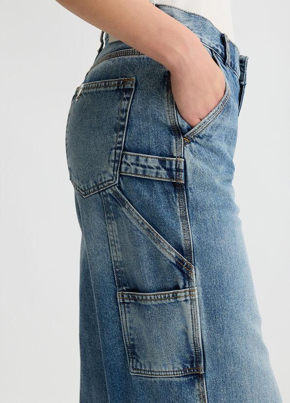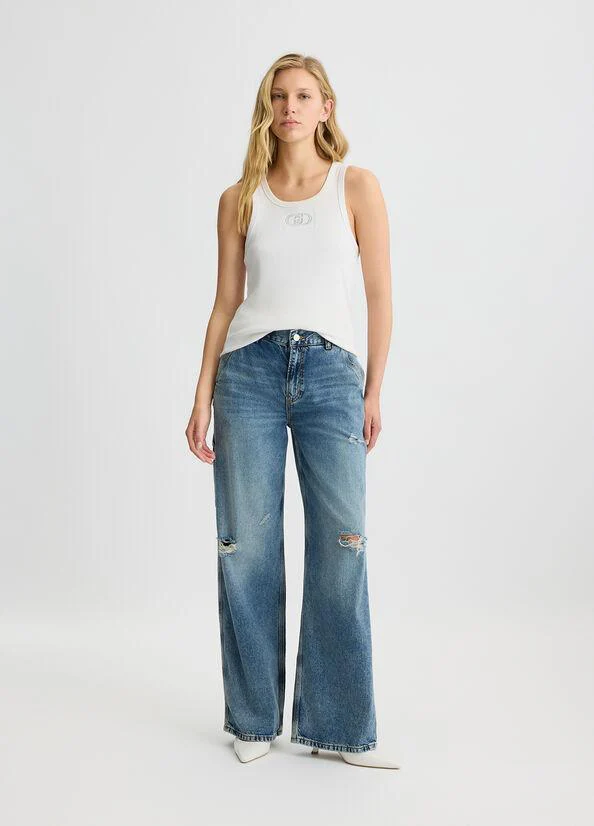 Jeans in denim di cotone, lavaggio used e dettagli destroyed, vita bassa, gamba flare, tasche sui fianchi e sul retro, salpa logata, logo in metallo, chiusura con bottone e zip nascosta