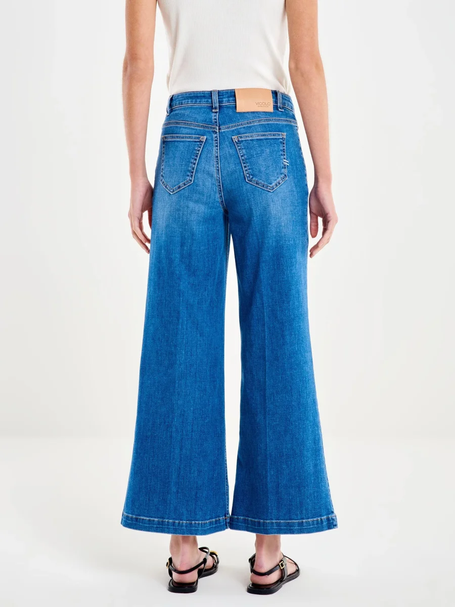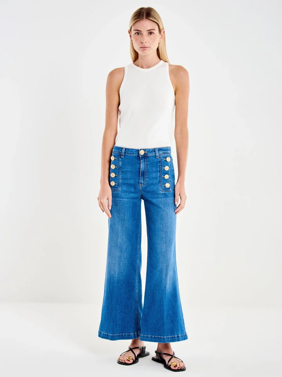 Jeans Vicolo media, modello wide leg, chiusura frontale con zip e bottone in metallo, bottoni oro, piega centrale, colore blu denim