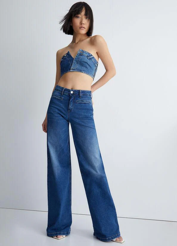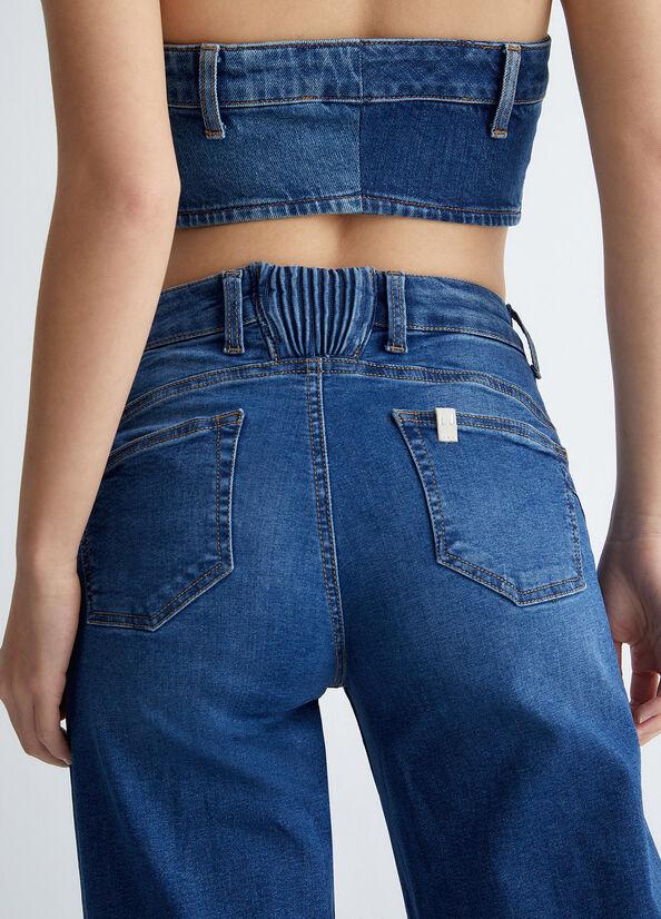 Jeans LiuJo donna, modello bottom up ecosostenibile in denim di cotone stretch, vita alta, tasche sul davanti e sul retro, inserto elastico in vita sul retro, logo sul retro