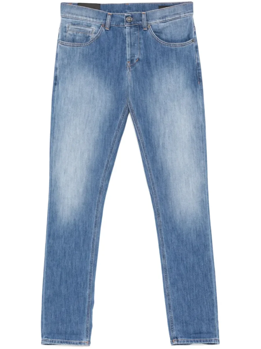 Jeans denim Dondup George, modello con chiusura bottoni in vita e passanti per cintura, cinque tasche classiche, logo posteriore, colore blu
