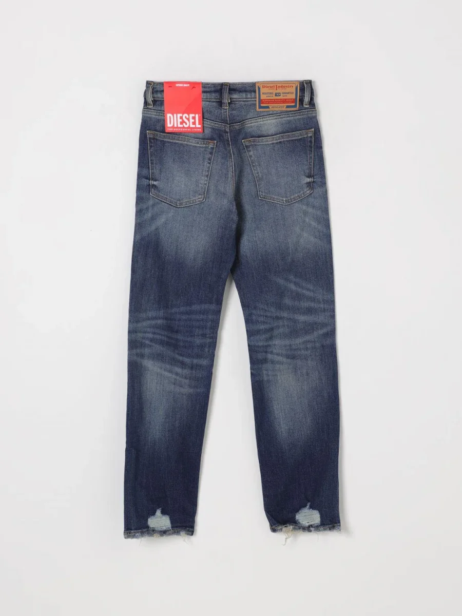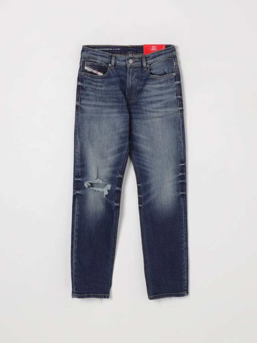 Jeans in denim Diesel, modello con chiusura bottone e passante in vita per cintura, cinque tasche, colore blu denim scuro