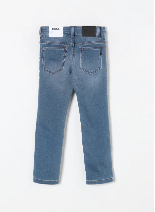 Jeans denim Boss junior, modello con logo applicato, bottone con zip, modello 5 tasche, vita con passanti, colore denim chiaro