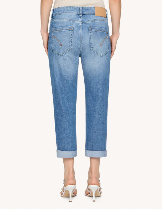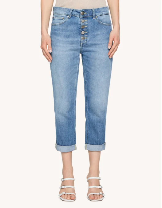Jeans Koons Dondup, modello cinque tasche loose fit, vita regolare, bottoniera gioiello, lunghezza alla caviglia