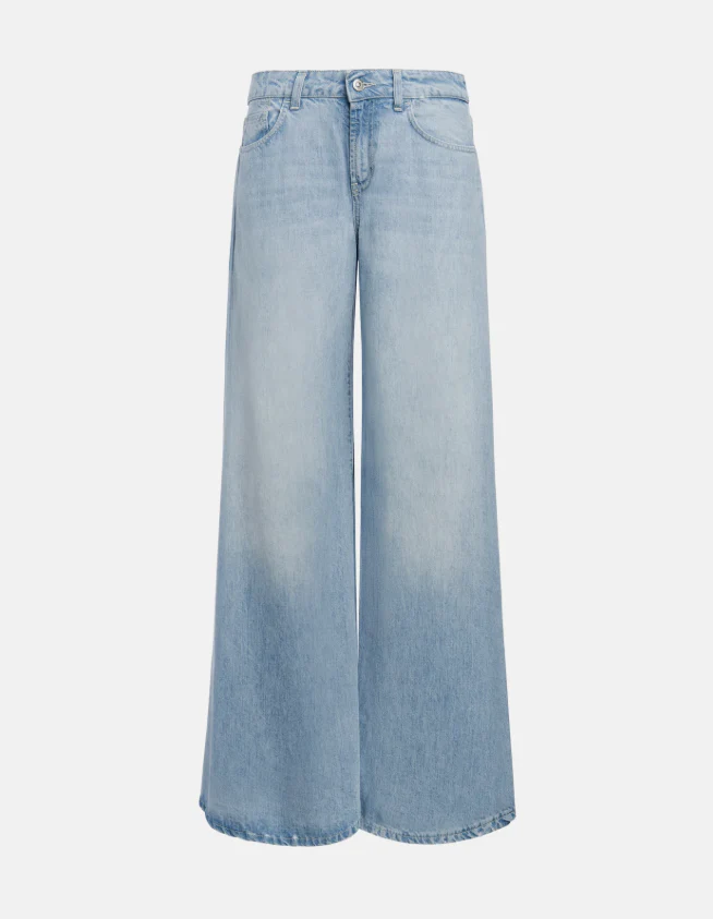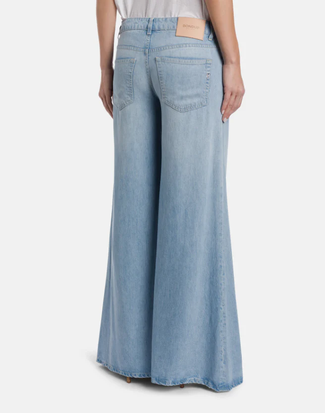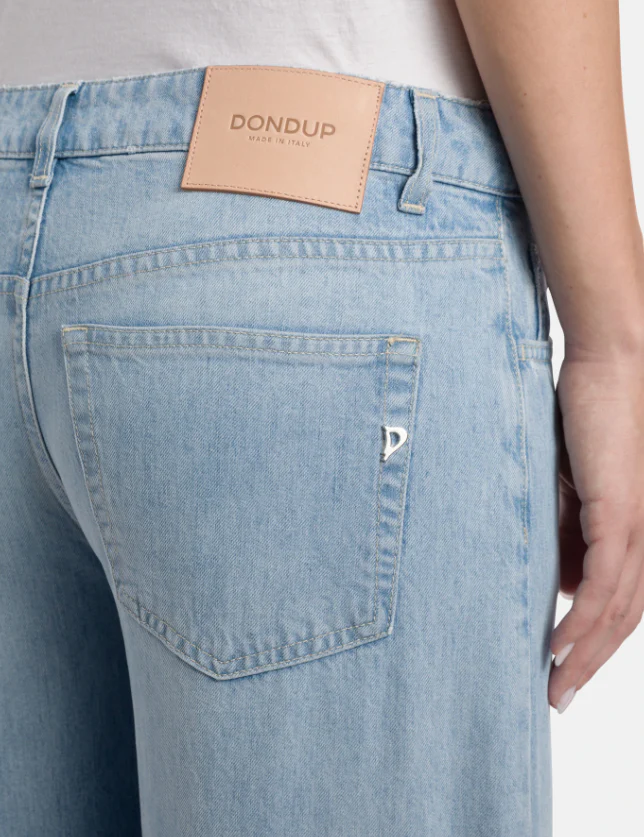 Jeans Marlen cinque tasche wide leg fit, vita regolare, gamba ampia, lavaggio chiaro pulito. Logo in contrasto Dondup