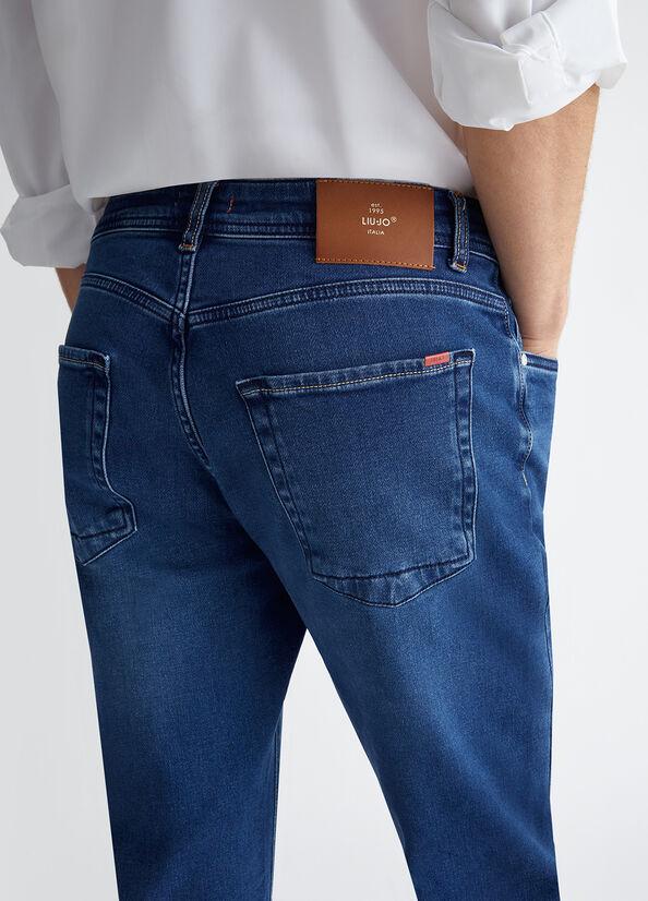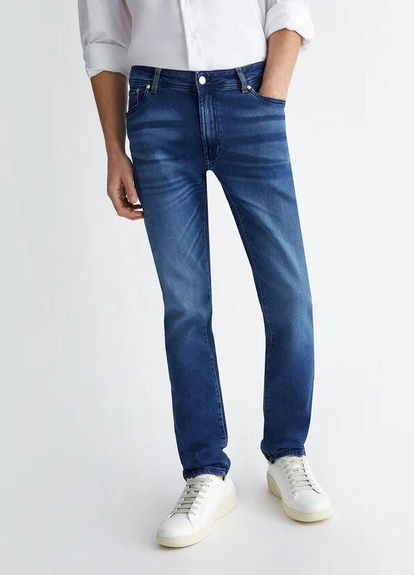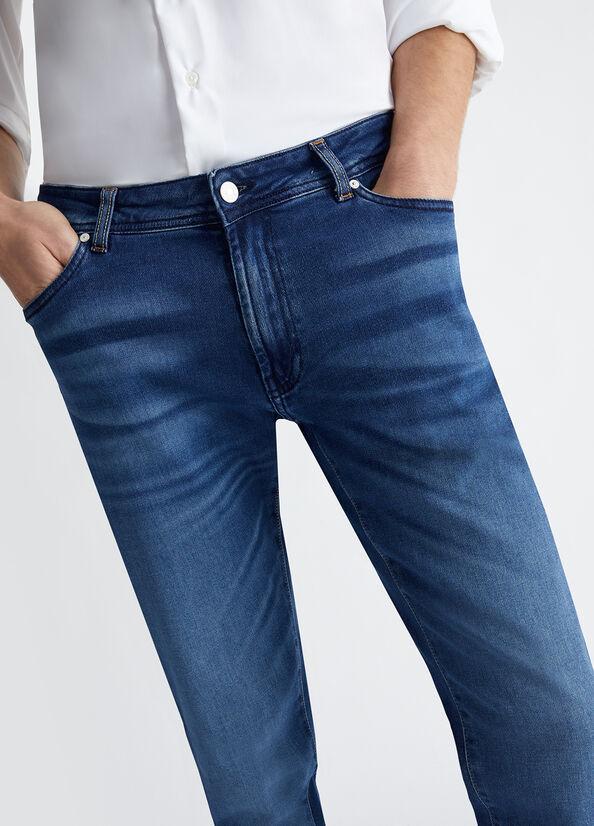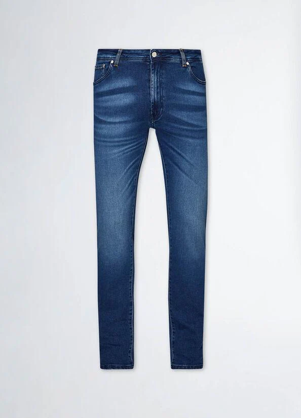 Jeans uomo in denim stretch, modello cinque tasche, slim fit, cuciture in contrasto colore, salpa in pelle e fondo stretto, colore blu denim