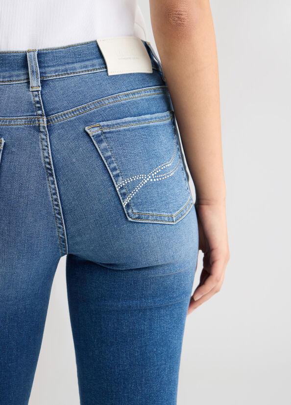 Jeans slim fit con strass Liu Jo, modello cinque tasche, strass applicati sulle tasche posteriori, colore blu denim