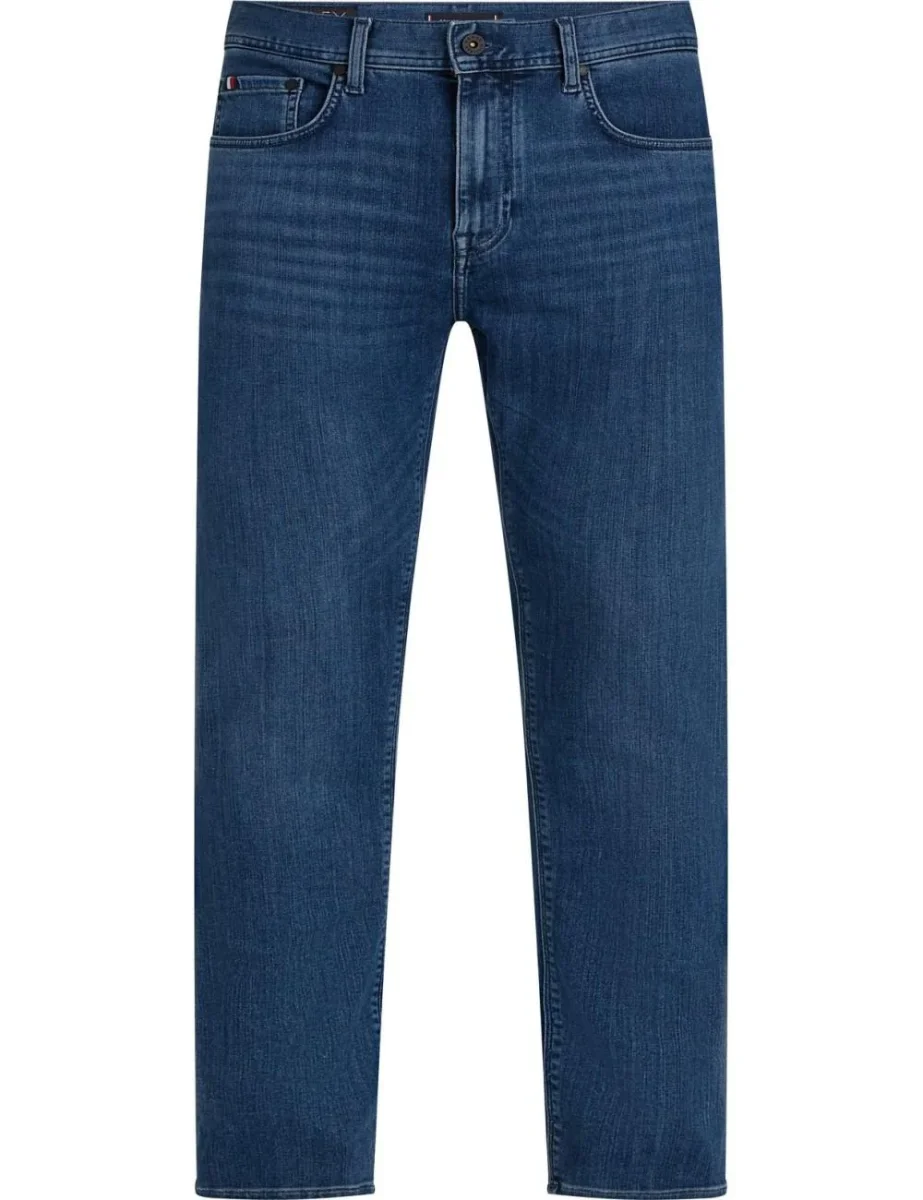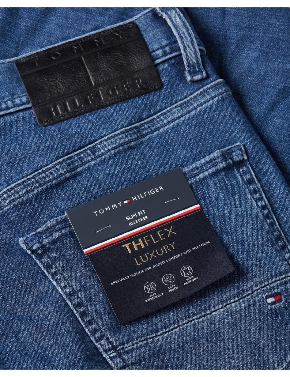 Jeans slim fit Tommy Hilfiger uomo, chiusura con cerniera e bottone, chiusura bottone e passanti per cintura, modello cinque tasche, colore blu denim