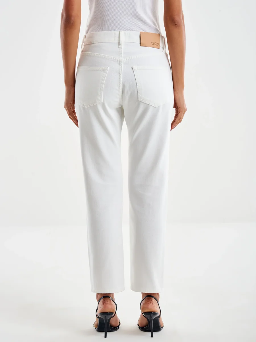 Jeans Zoe baggy, modello a vita bassa, cinque tasche, chiusura frontale con bottoni gioiello e zip nascosta, colore bianco