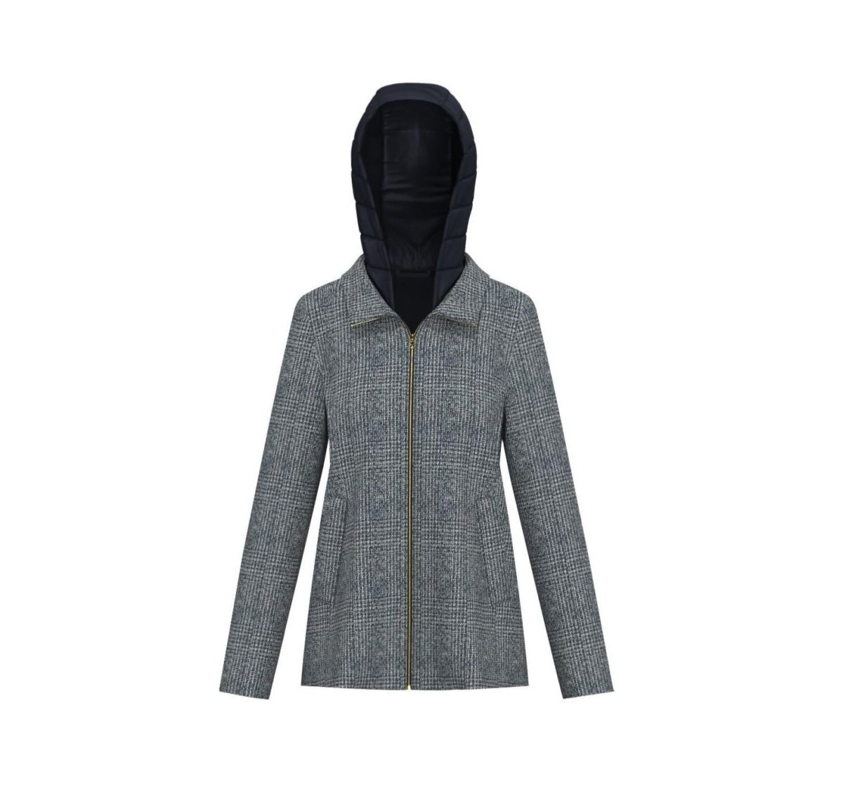 Caban in jersey jacquard, collo a camicia con cappuccio rimovibile, chiusura con full zip frontale, cappuccio in tessuto tecnico, colore blu