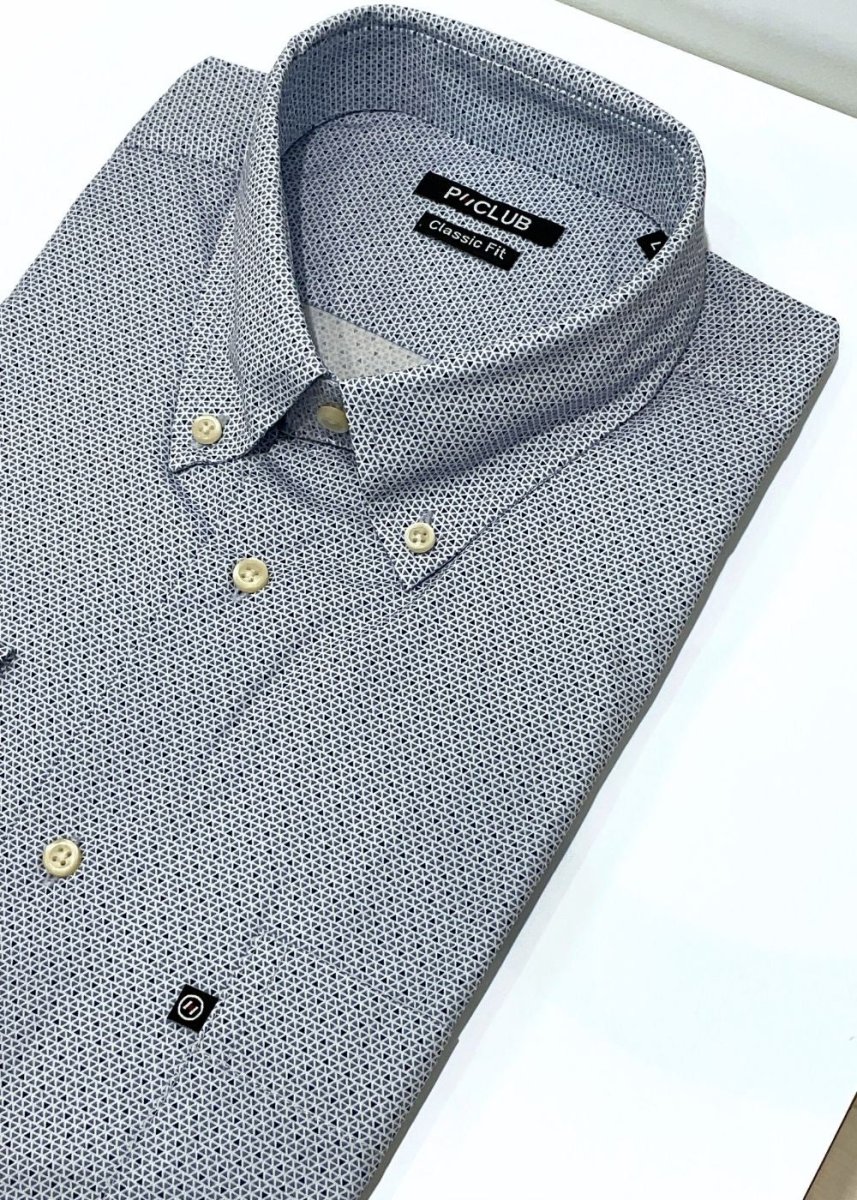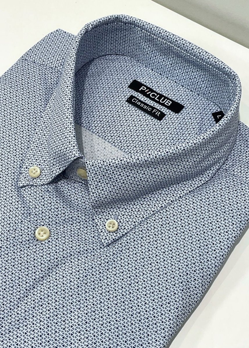 La camicia è di colore celeste con un fine motivo a piccoli disegni geometrici. Ha un colletto button-down, abbottonatura centrale e sui polsini.