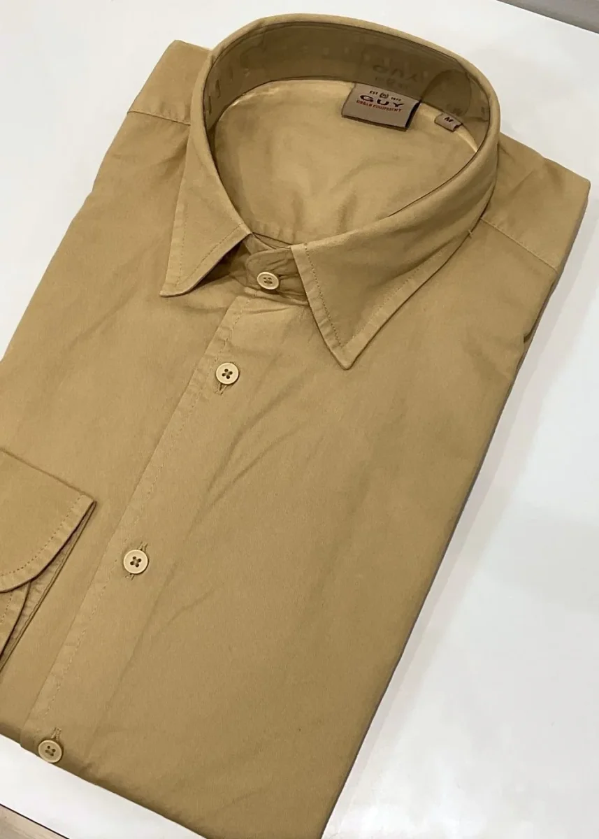 La camicia è di colore beige, colletto morbido, abbottonatura centrale e sui polsini.