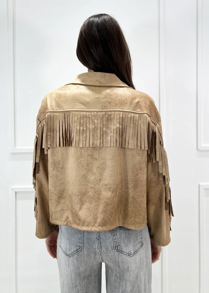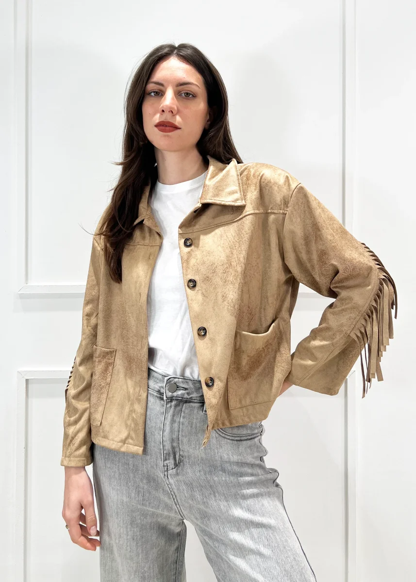 Descrizione: Giacca modello cropped. Frange applicate sulla manica. Chiusura frontale 5 bottoni, tasche a toppa.