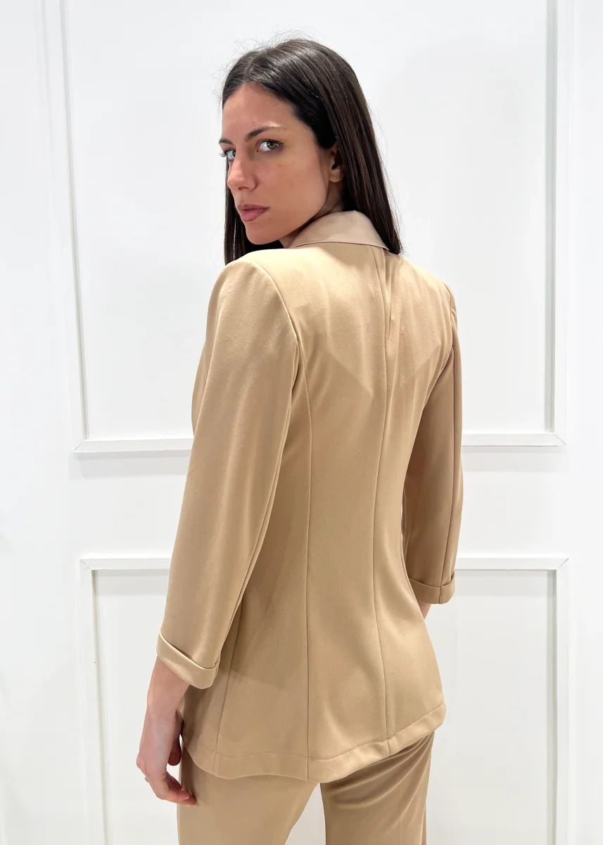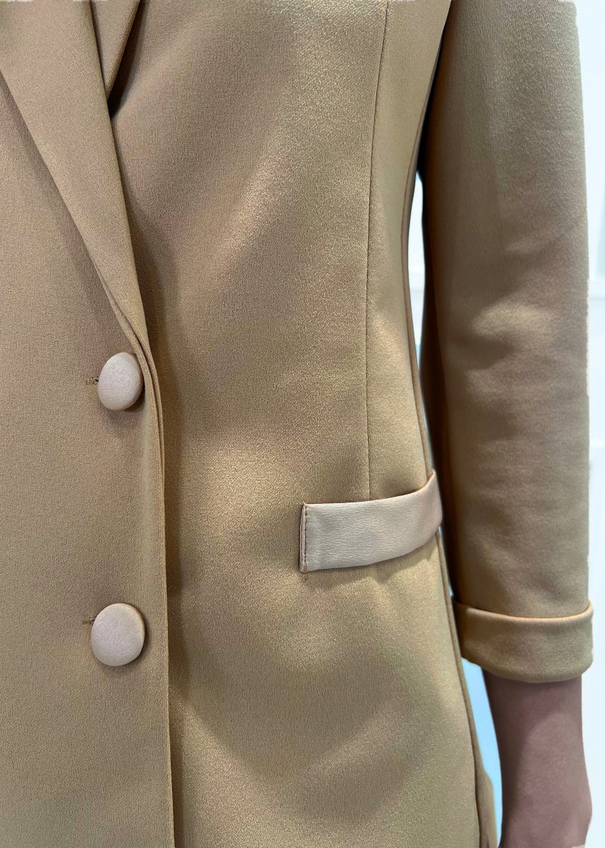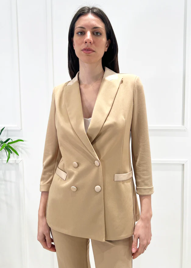 Descrizione: Giacca doppio petto. Chiusura frontale a doppiopetto con bottoni tono su tono foderati.