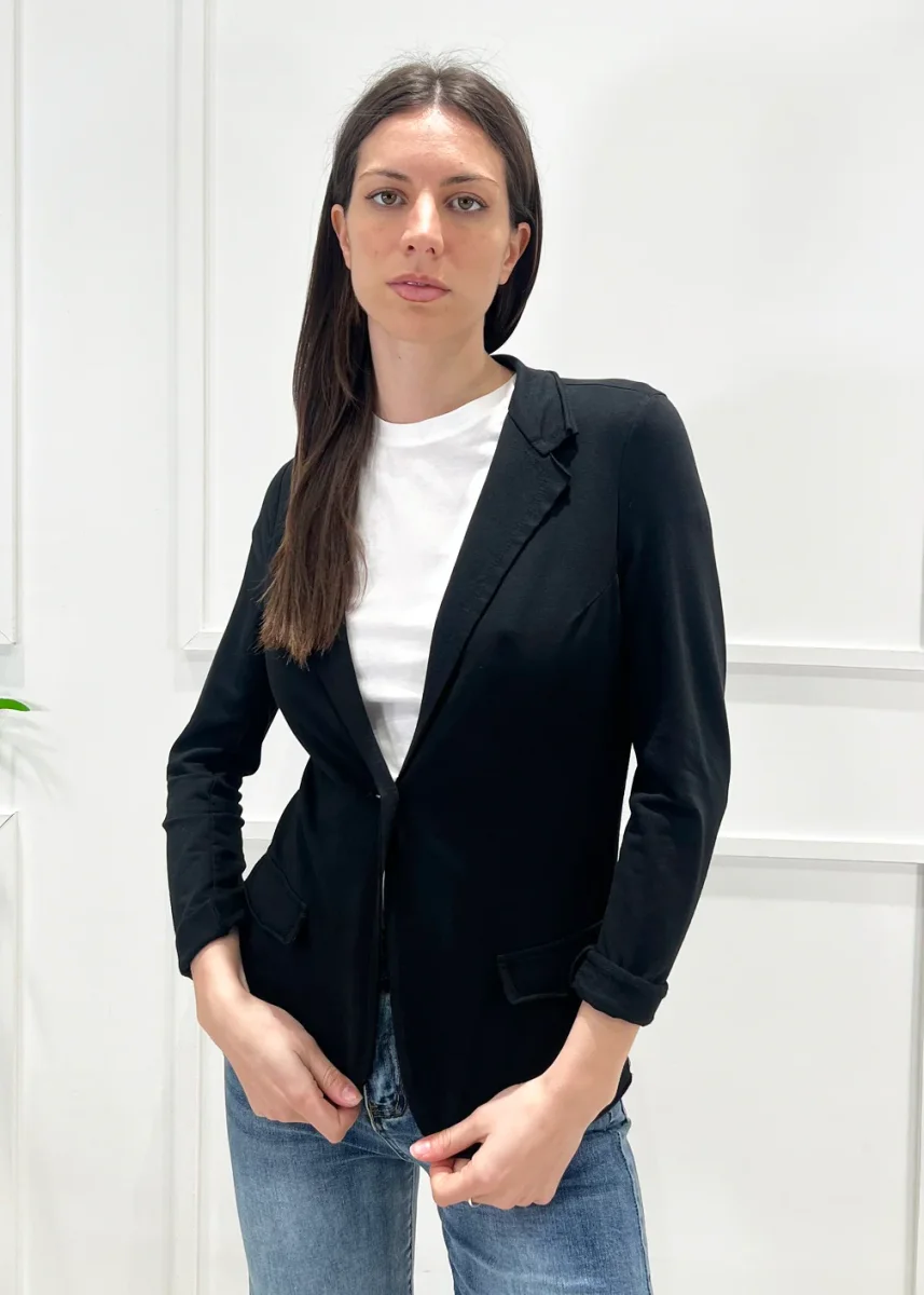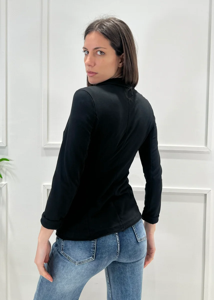 Descrizione: Giacca tessuto felpa, nero. Chiusura con un bottone frontale dello stesso colore.