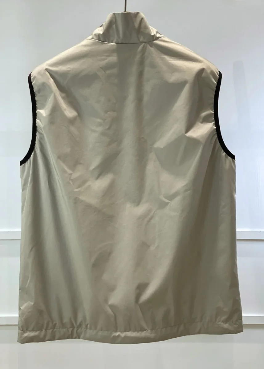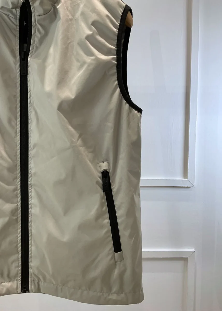 Smanicato di colore perla con chiusura a cerniera nera centrale e due tasche con cerniera di colore nero sui lati.