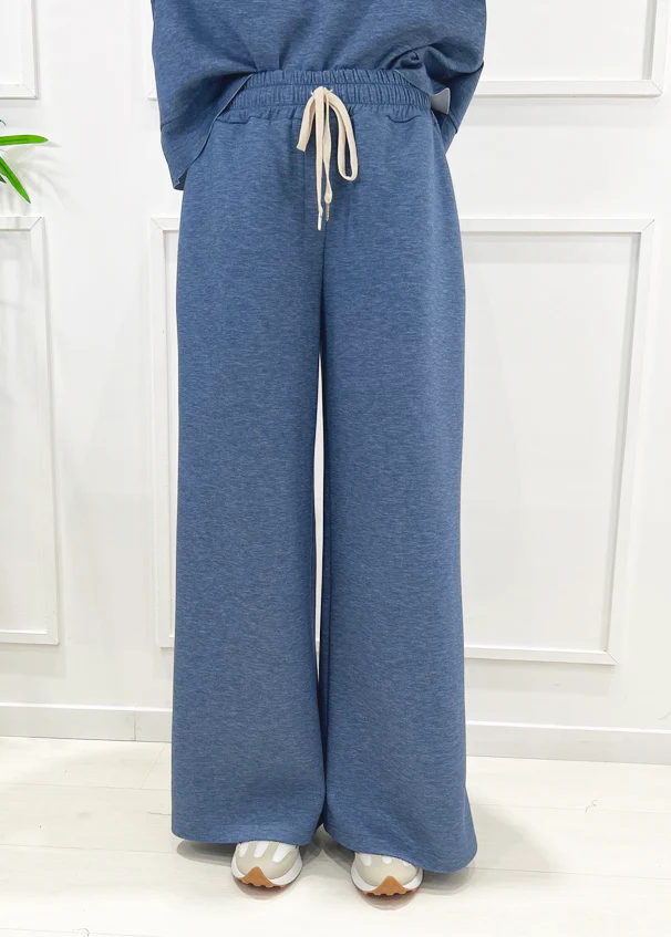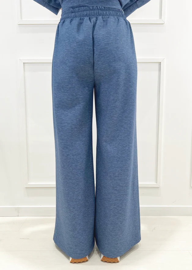 Descrizione: Pantalone in felpa, color Denim. Fondo ampio, coulisse in vita.