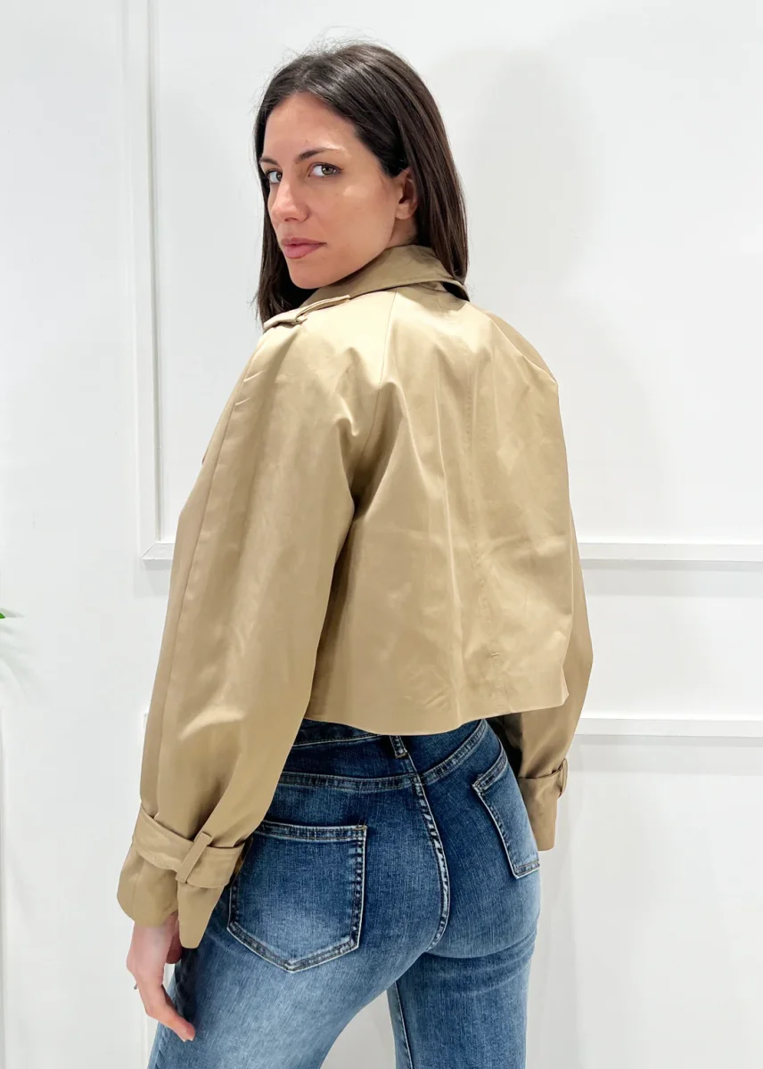 Descrizione: Giacca beige corta con design a doppio petto, bottoni in vista e un colletto classico. Inoltre, le maniche presentano dei cinturini con fibbie sui polsi.