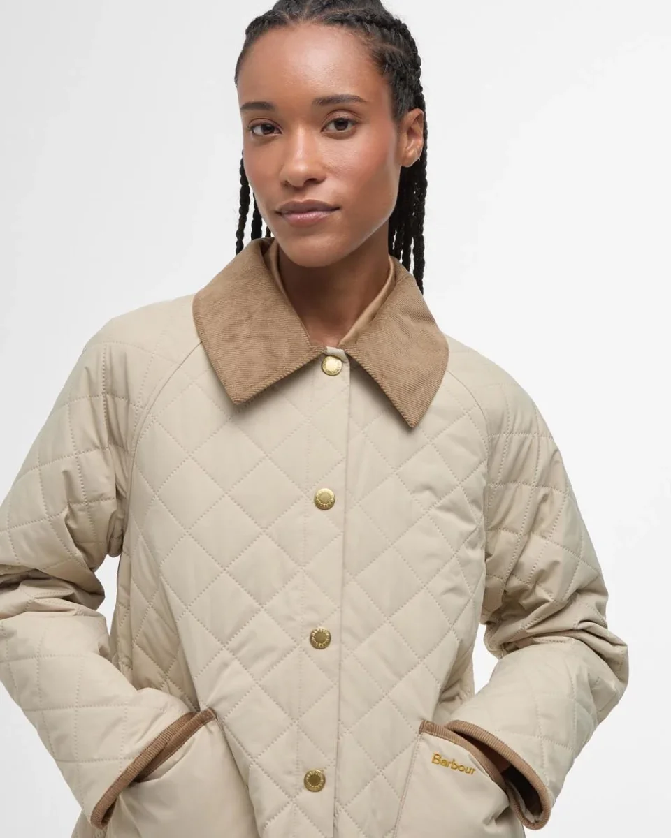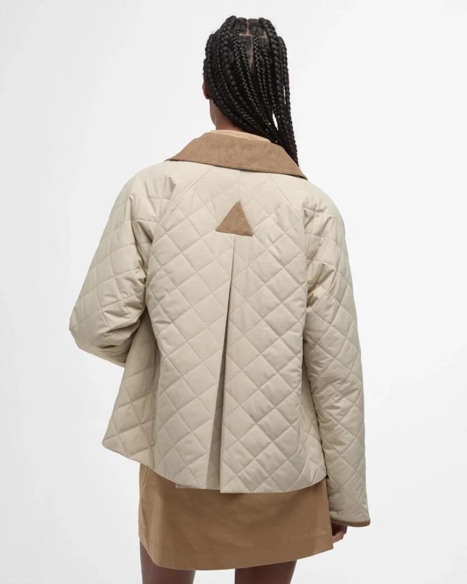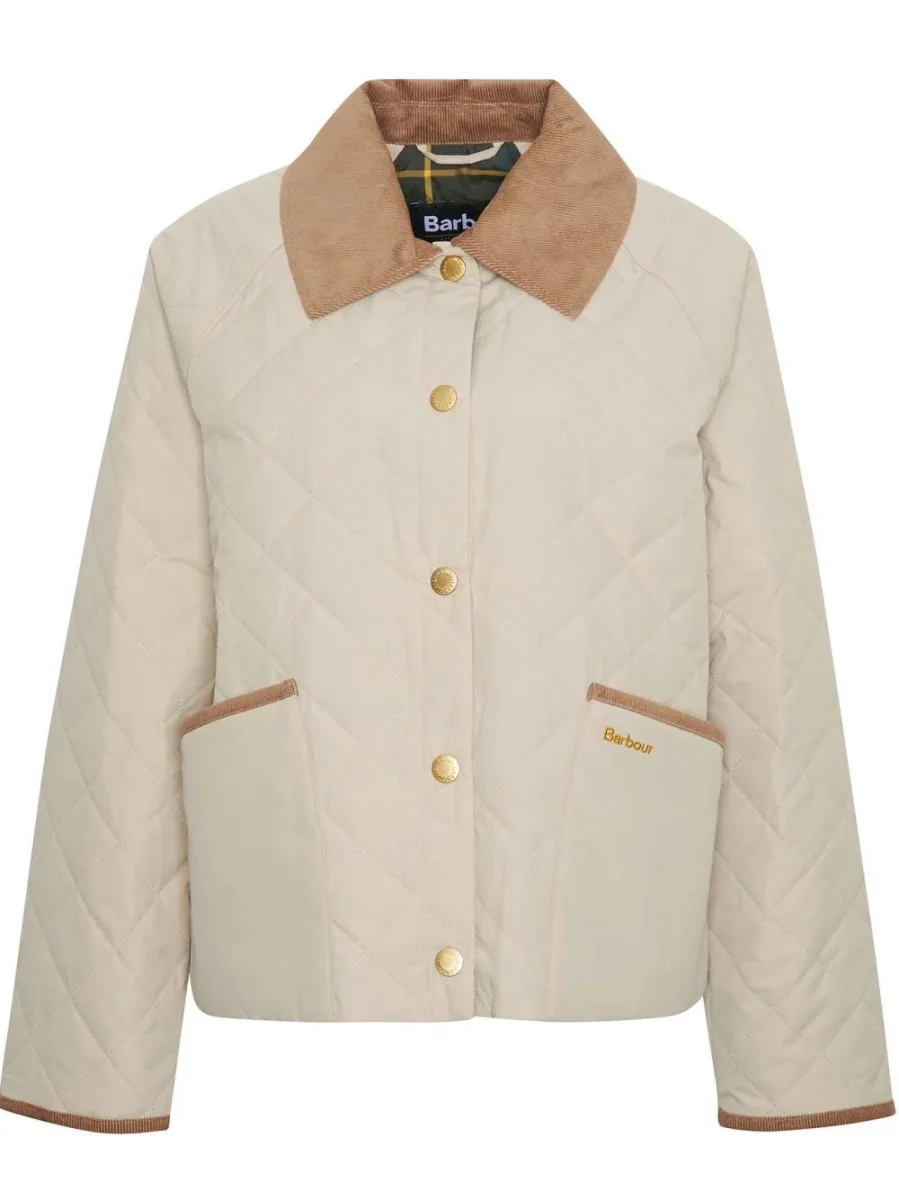 La giacca trapuntata Anise di Barbour. Il caratteristico colletto in velluto a coste di Barbour è abbinato alle finiture coordinate sulle tasche e sui polsini. Rifinito da bottoni a pressione in ottone logati e un logo ricamato sul taschino