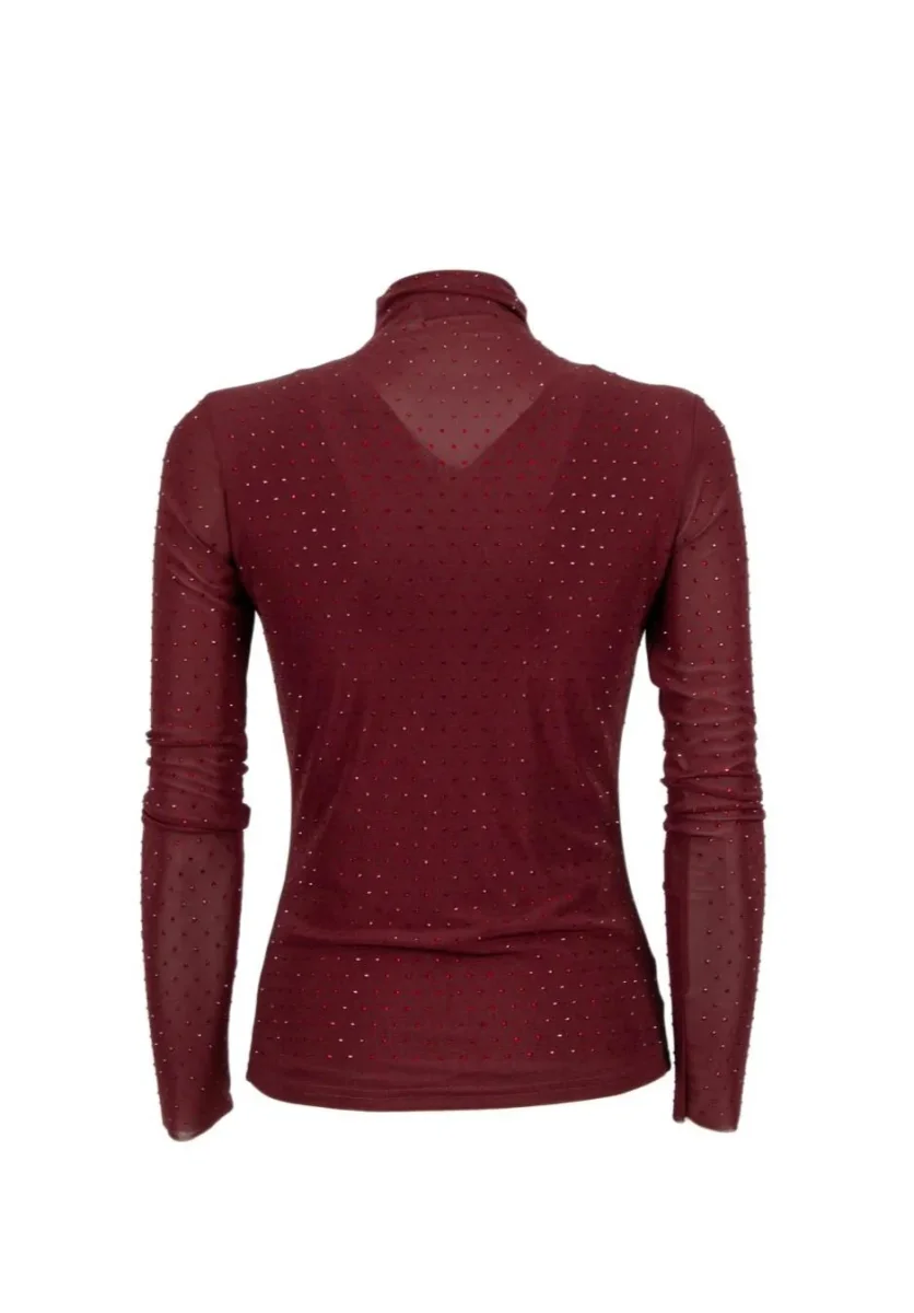 Maglia a collo alto, vestibilità aderente, maniche lunghe, tulle trasparente, strass applicati, colore bordeaux