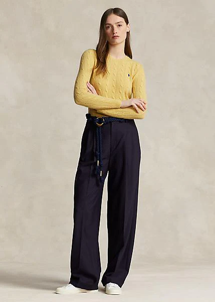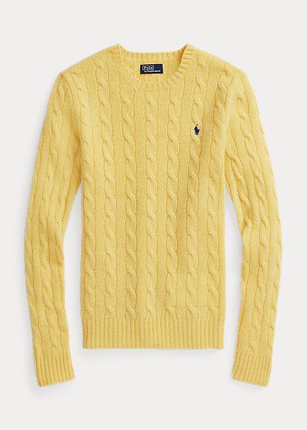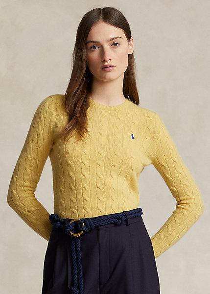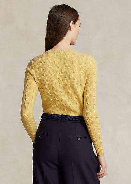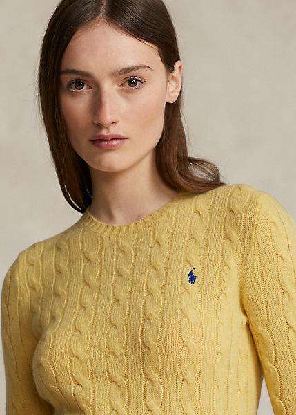 Maglioncino girocollo Polo Ralph Lauren donna, modello girocollo, maniche lunghe, realizzato in lana e cashmere, logo in contrasto rosso, colore giallo