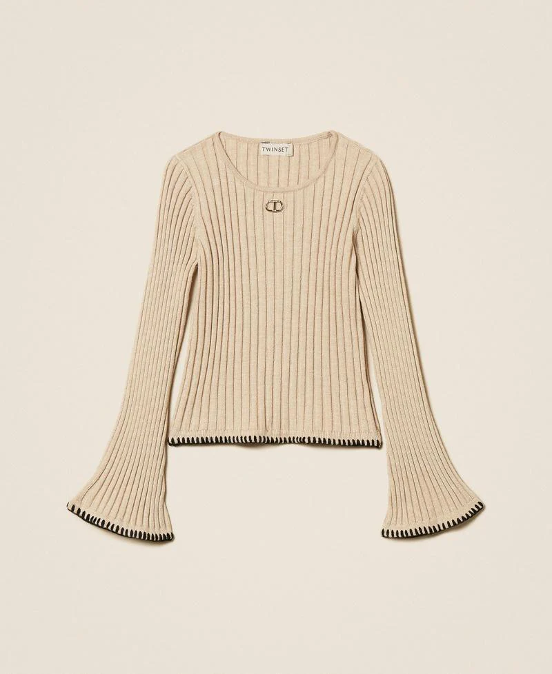 Maglia Twinset Girl, modello in misto viscosa con lavorazione a coste, ricamo a contrasto ai fondi, collo rotondo con apertura a goccia e placchetta logo