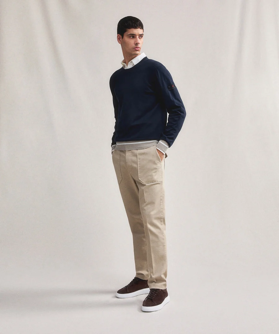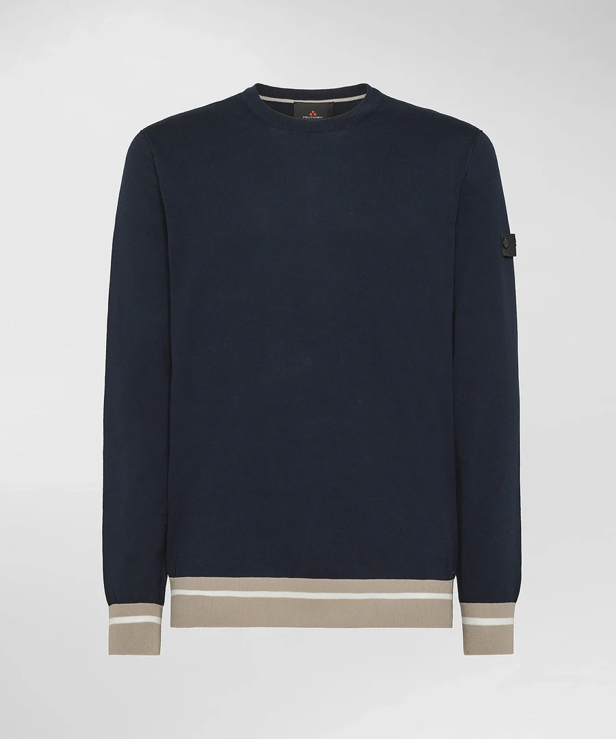 Maglia Peuterey uomo, girocollo e vestibilità regular. Logo ricamato sul fianco in vita, manica lunga. Polsini e fondo in contrasto colore, colore blu