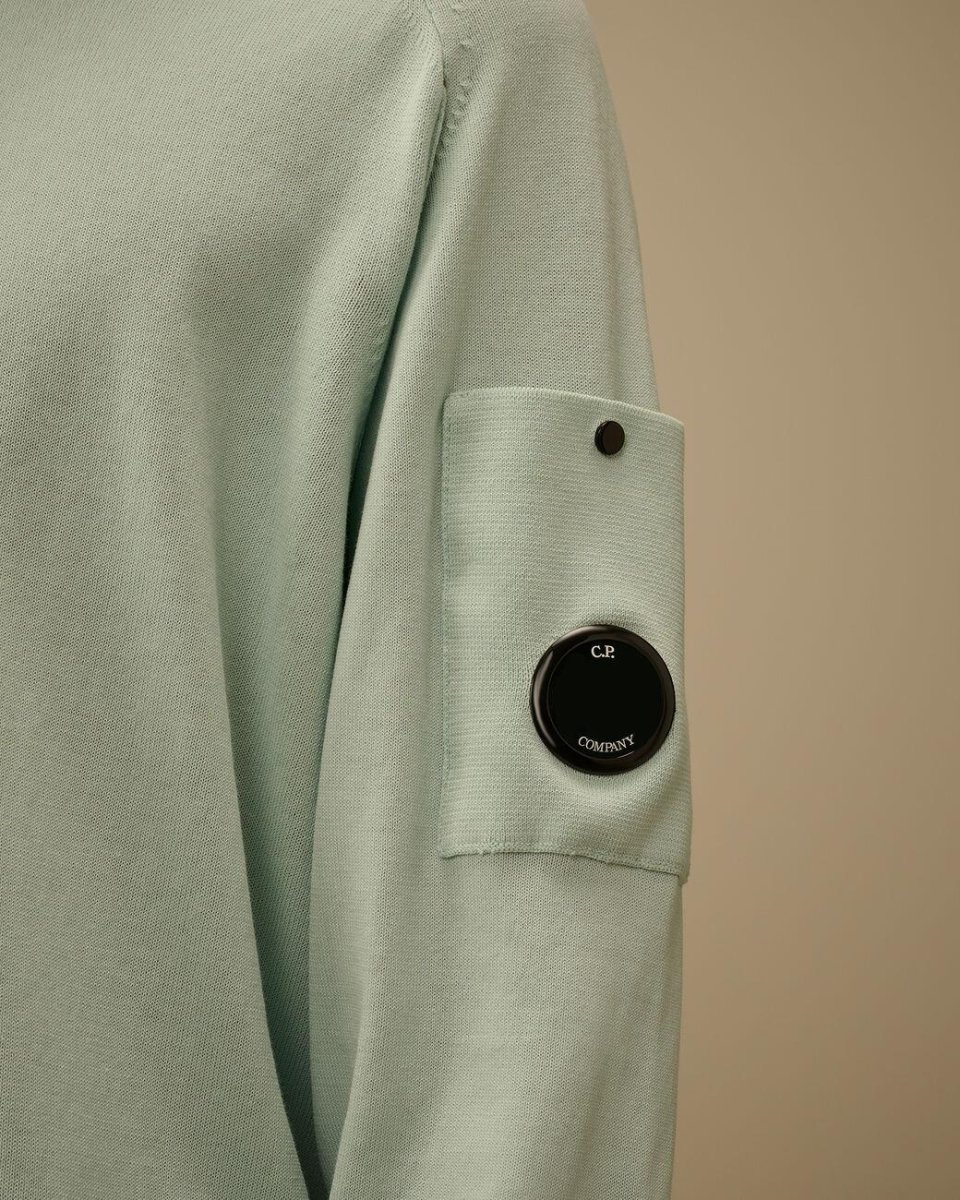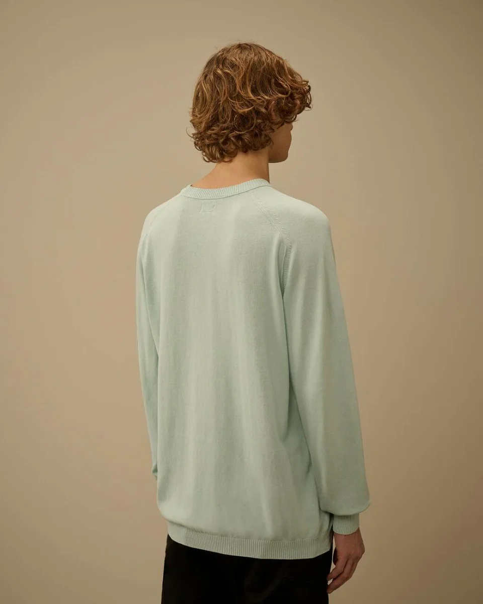 Maglione CP Company, girocollo a costine, cuciture a contrasto, taschino con lente, polsino e orlo a costine, finezza 14, regular fit, colore celeste