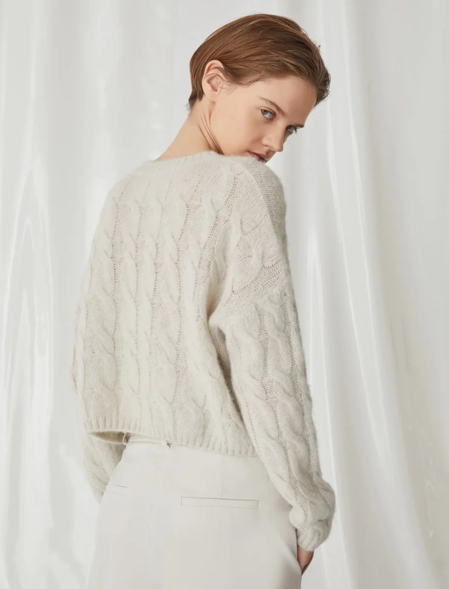 Maglia cropped in misto alpaca Marella Monochrome Clarino1, scollo rotondo, maniche lunghe con giro sceso, lavorazione a trecce con bordi a coste, colore bianco