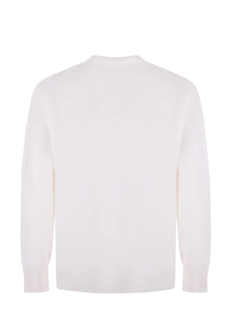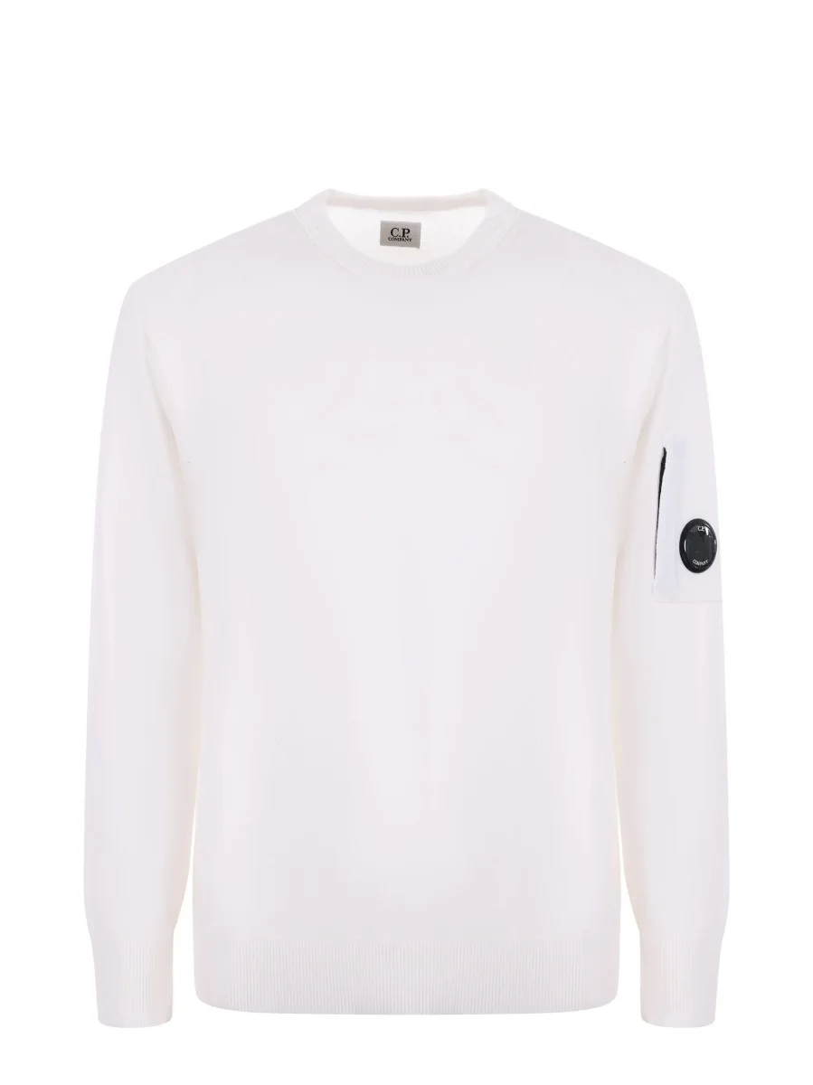 Maglione girocollo realizzata in lana merino extrafine. Il filato morbido e leggero offre una texture raffinata e un comfort superiore. Il modello presenta l’iconica Lente di C.P. Company, polsini e orlo a costine. Rifinito con cuciture a contrasto. Finezza 12. Regular fit. Colore bianco