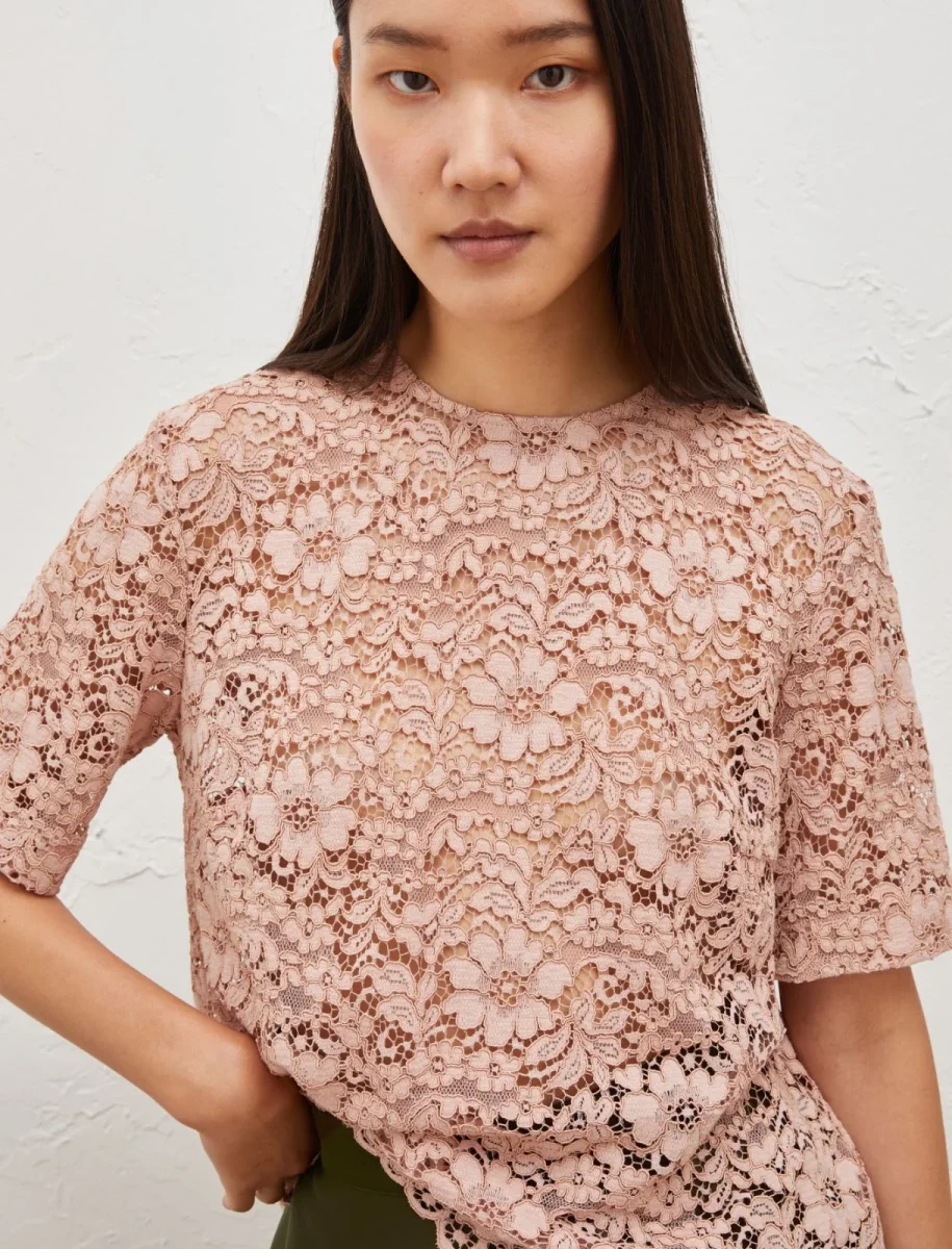T-shirt in pizzo Marella, fit dritto, scollo rotondo con goccia posteriore, maniche corte e smerlo a fondo capo, colore rosa