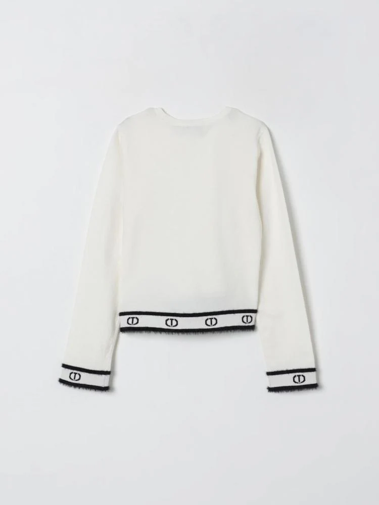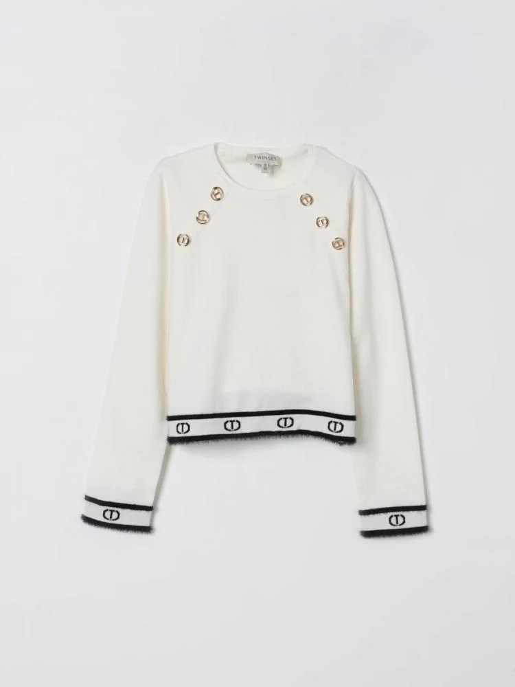 Maglia in lana Twinset Girl, modello girocollo e maniche lunghe, dettaglio con bottoncini applicati e fondo logato, colore bianco