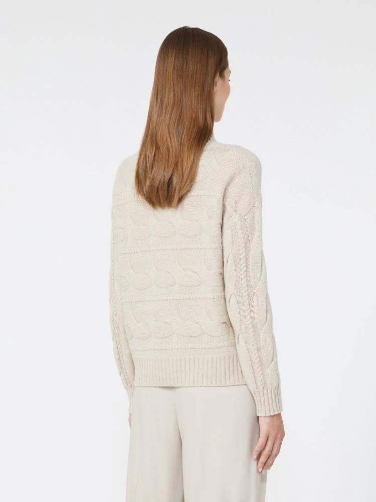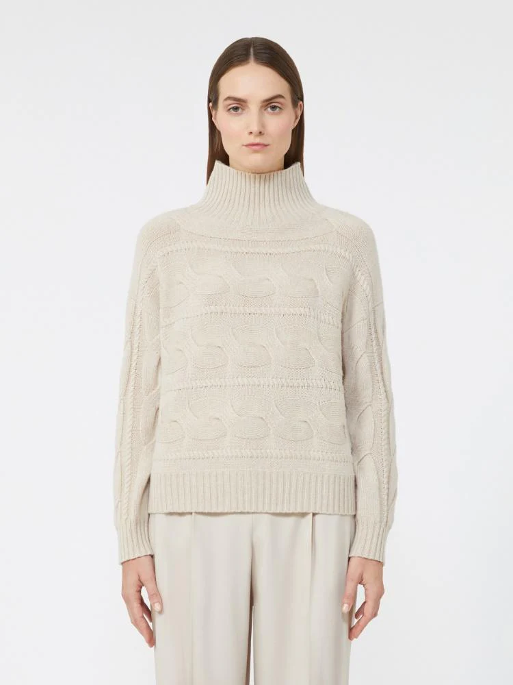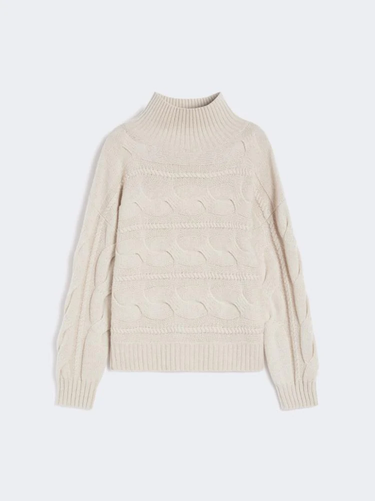 Maglia in filato di lana cachemire, volume ampio, collo alto a cratere, maniche lunghe a giro basso, polsi e bordo a costine, colore beige