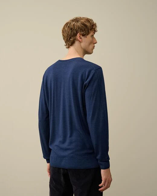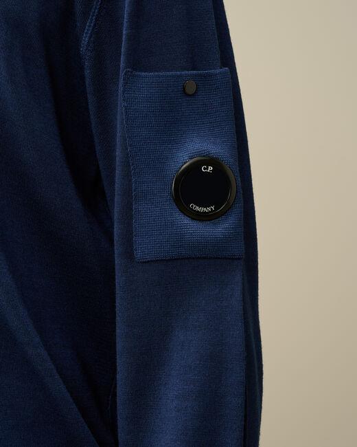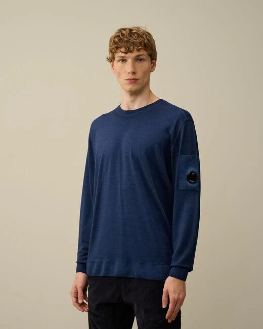 Maglia C.P. Company uomo, modello girocollo a costine, taschino con lente iconica sulla manica, polsini e orlo a costine, finezza 14 e regular fit, colore blu