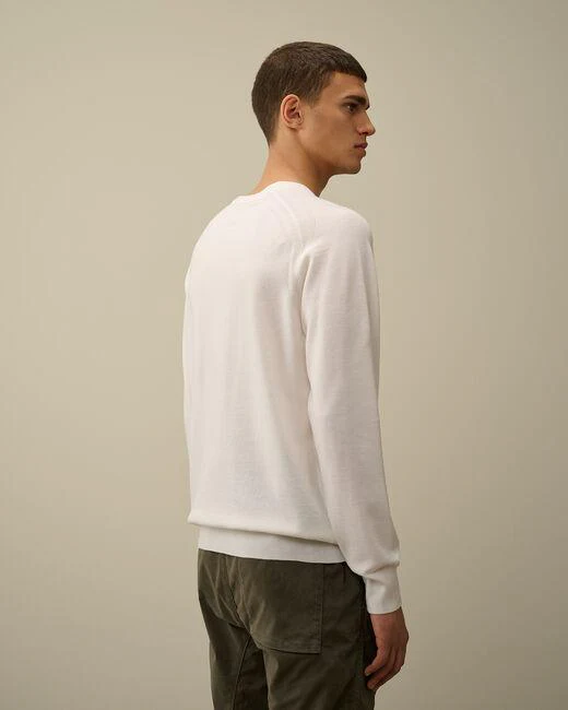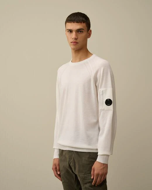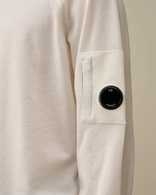 Maglia CP Company uomo, modello girocollo a costine, taschino con lente iconica sulla manica, polsi e orlo a costine, finezza 12, vestibilità regular, colore bianco