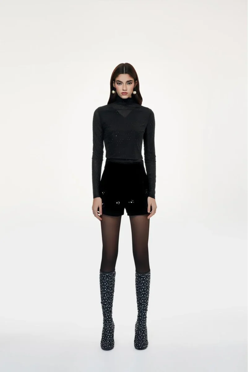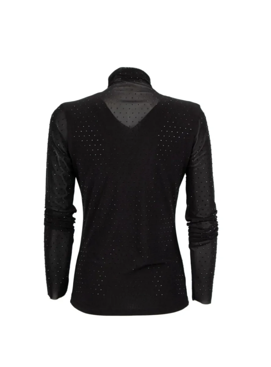 Maglia a collo alto. Vestibilità aderente. Maniche lunghe. Tulle trasparente. Strass applicati su tutta la superficie