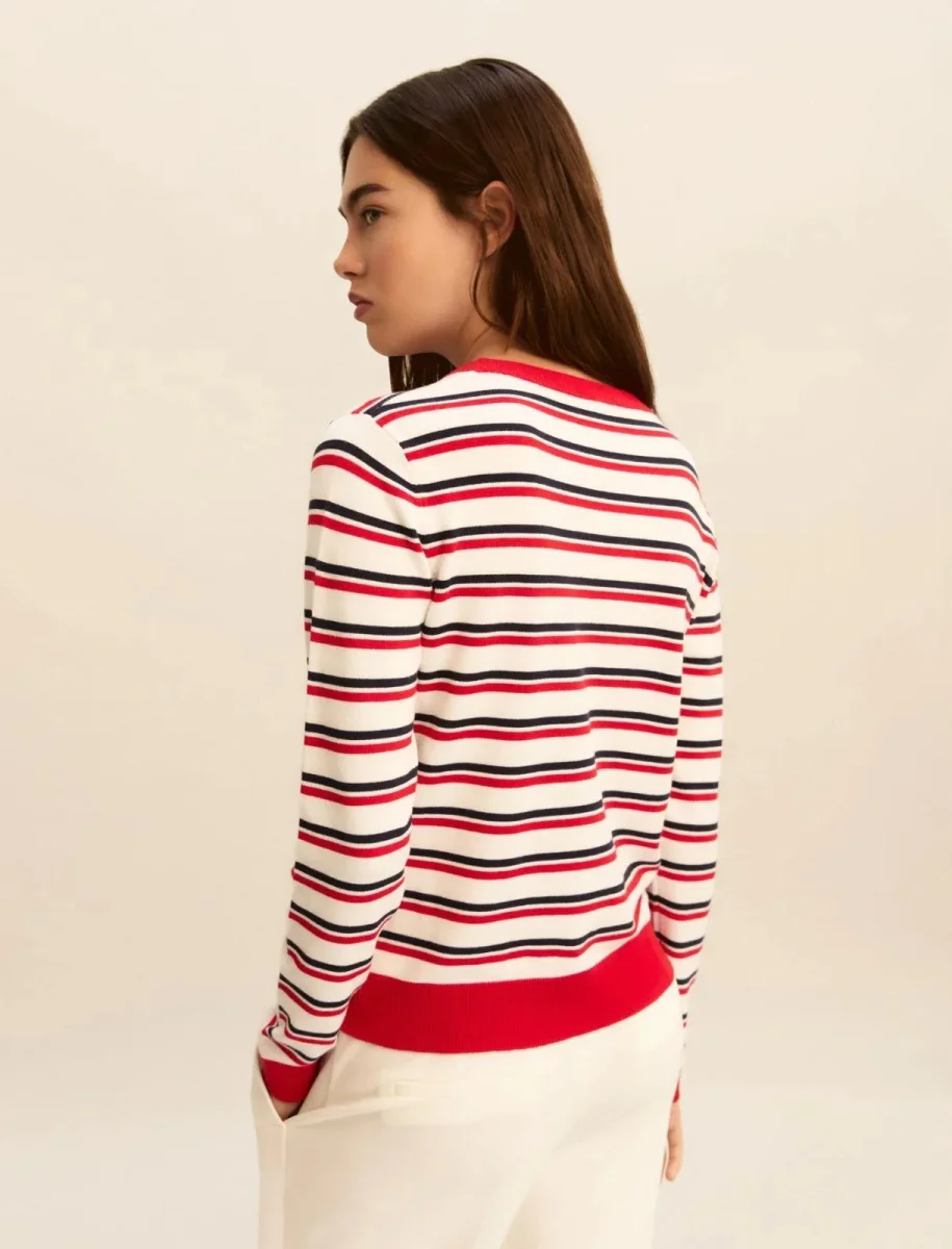 Maglia in viscosa stretch Emme Marella, fit regolare, scollo a giro, motivo di ricamo monogramm a contrasto, colore righe bianche e rosse