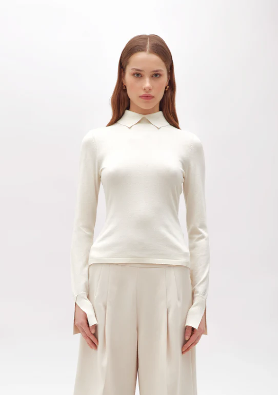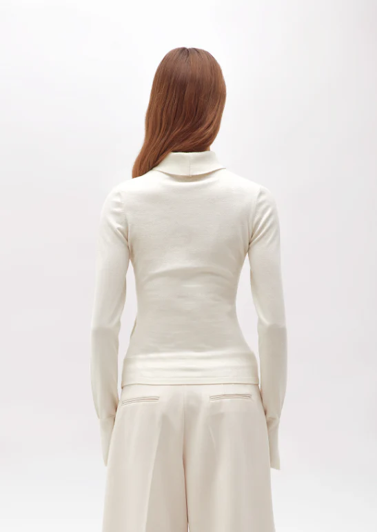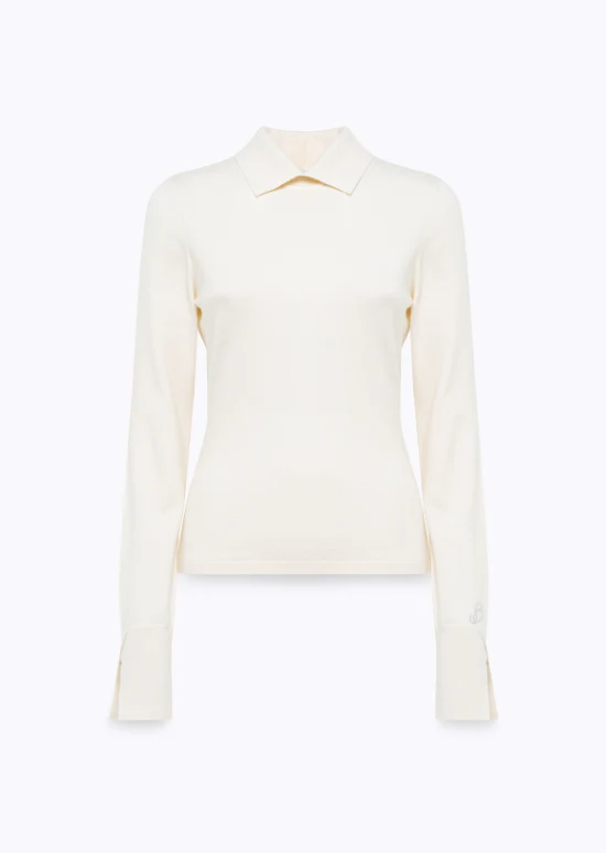 Maglia basic in viscosa stretch, lavorazione rasata, colletto e maniche lunghe con spacchetti, logo sulla manica con applicazione cristalli, colore bianco