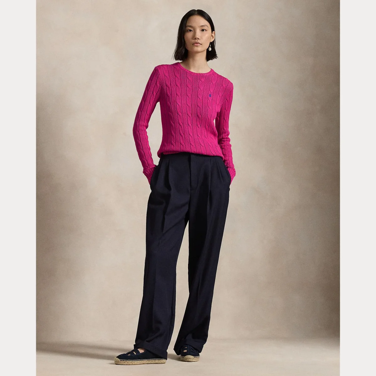 Maglioncino slim fit donna, modello girocollo e maniche lunghe, polsini a costine, logo pony iconico ricamato sul lato sinistro del petto, colore fucsia